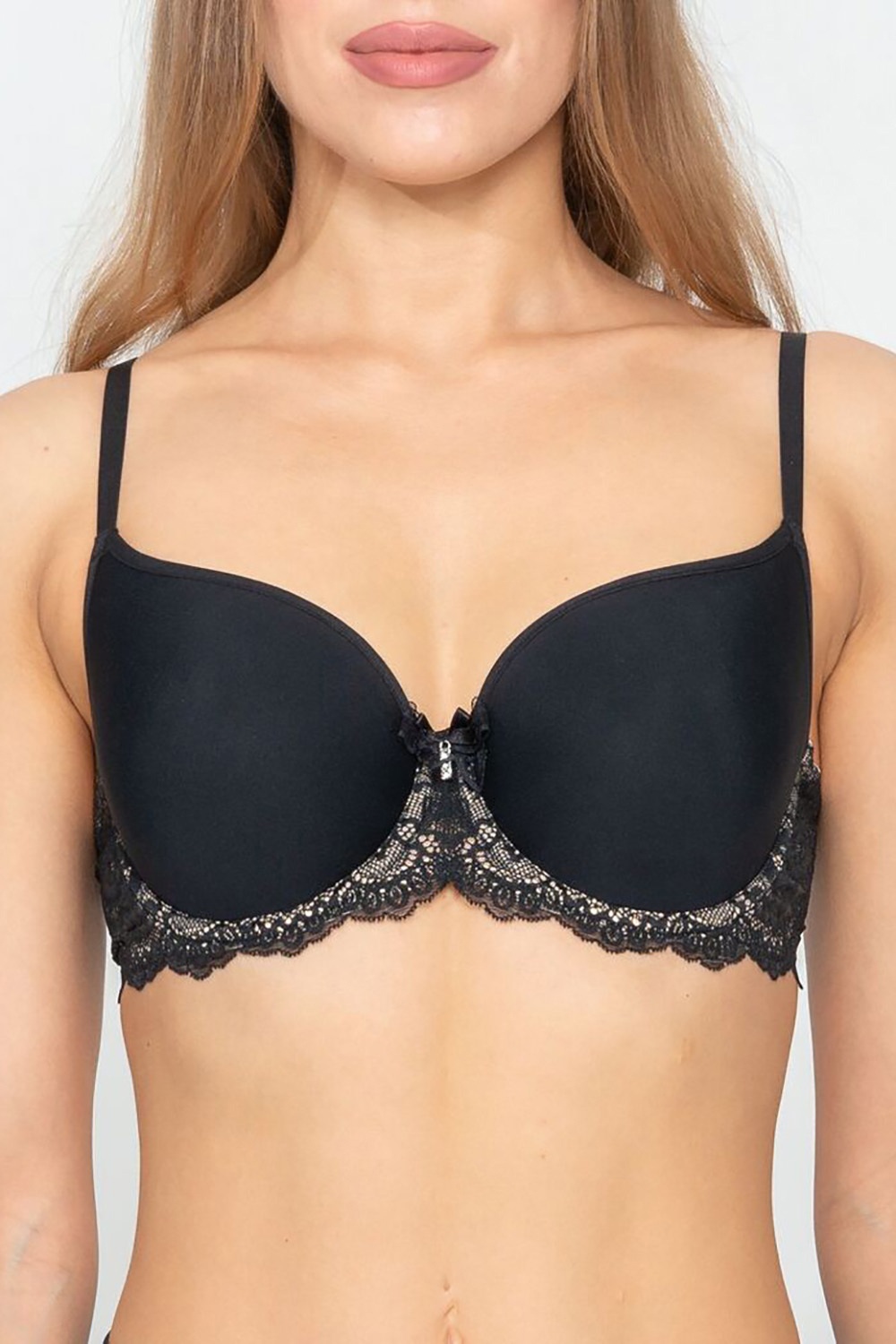 Бюстгальтер на каркасах с бесшовными формованными чашками из 3D материала Spacer (, Спейсер), . Под термином «Spacer» понимается очень легкий и дышащий материал, приятный на ощупь, прекрасно держащий форму. Украшение: бантик с подвеской из трех страз.