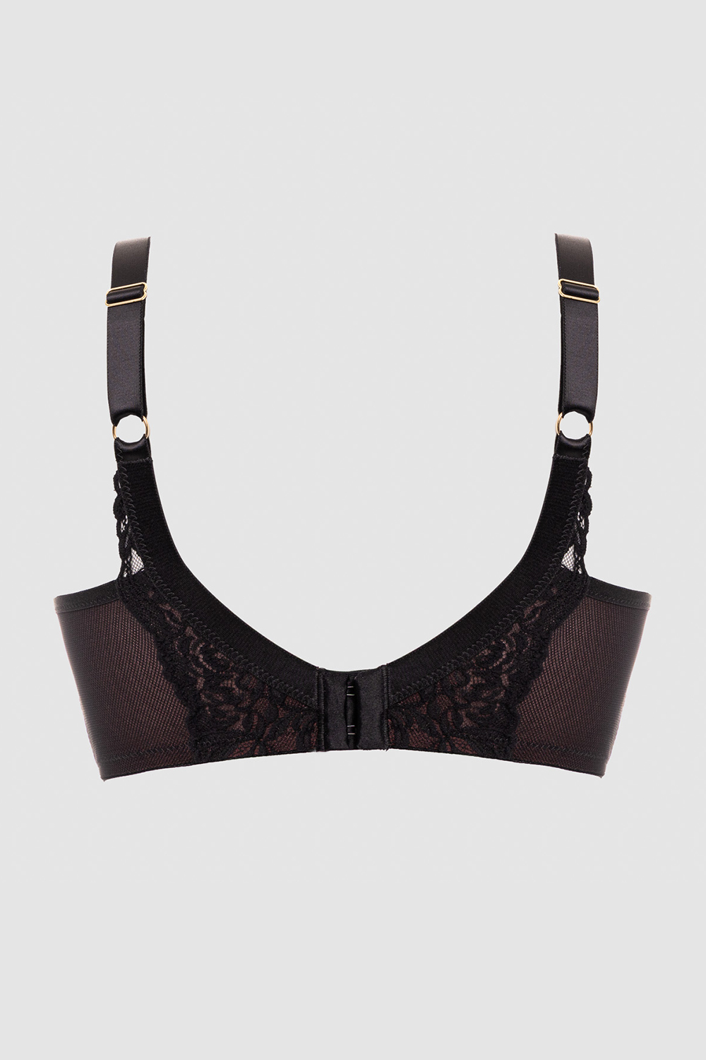 Бюстгальтер Truffle Noir на косточках, с боковой поддержкой, нижняя часть чашки на уплотнителе, верхняя из нежного кружева. Внутри чашечки проложены хлопковым трикотажем. Бретельки не отстегиваются, регулируются по длине. На спинке застежка регулируется.