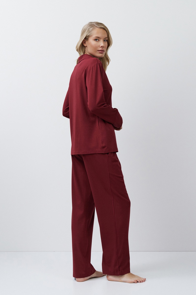 Пижама женская со штанами CADANCE BURGUNDY для вашего ночного комфорта. Пижама выполнена из эластичной ткани в состав которой входит модал и хлопок. Рубашка на пуговицах, с длинными рукавами, отложным воротником и нагрудным карманом. Окантовка дополняет и украшает комплект. Штаны длинные, свободной формы, с эластичным поясом и боковыми карманами. Расслабьтесь с максимальным комфортом и стилем в пижаме CADANCE.