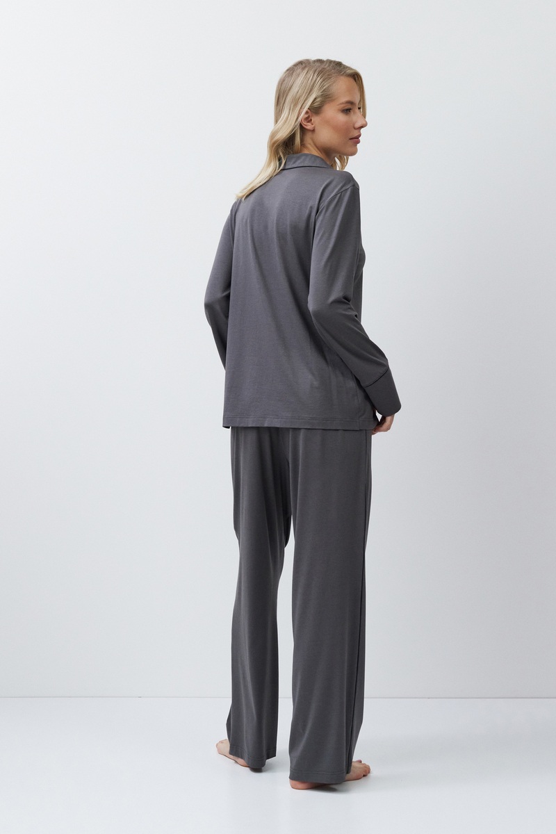 Пижама женская со штанами CADANCE GREY для вашего ночного комфорта. Пижама выполнена из эластичной ткани в состав которой входит модал и хлопок. Рубашка на пуговицах, с длинными рукавами, отложным воротником и нагрудным карманом. Окантовка дополняет и украшает комплект. Штаны длинные, свободной формы, с эластичным поясом и боковыми карманами. Расслабьтесь с максимальным комфортом и стилем в пижаме CADANCE.