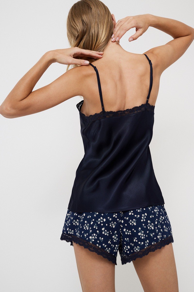 Представляем вашему вниманию пижаму с шортами Camellia, в которых безупречный комфорт сочетается с изысканной элегантностью. Топ с V-образным вырезом, изготовленный из блестящей вискозы, украшен изящными кружевными деталями вдоль выреза и на спине. Регулируемые бретели обеспечивают идеальную посадку, а глубокий синий цвет добавляет изысканности. Шорты украшены кружевом вдоль нижнего края и эластичным поясом с регулируемым шнурком. Этот комплект сочетает в себе стиль и комфорт для отдыха. Шорты изготовлены из матовой вискозы с тёмно-синим цветочным принтом. Независимо от того, отдыхаете ли вы с чашкой чая или наслаждаетесь уютным вечером за просмотром фильма, пижама Camellia поднимет ваш образ на новый уровень безупречной красоты и лёгкого шика.
