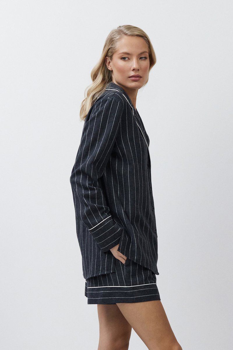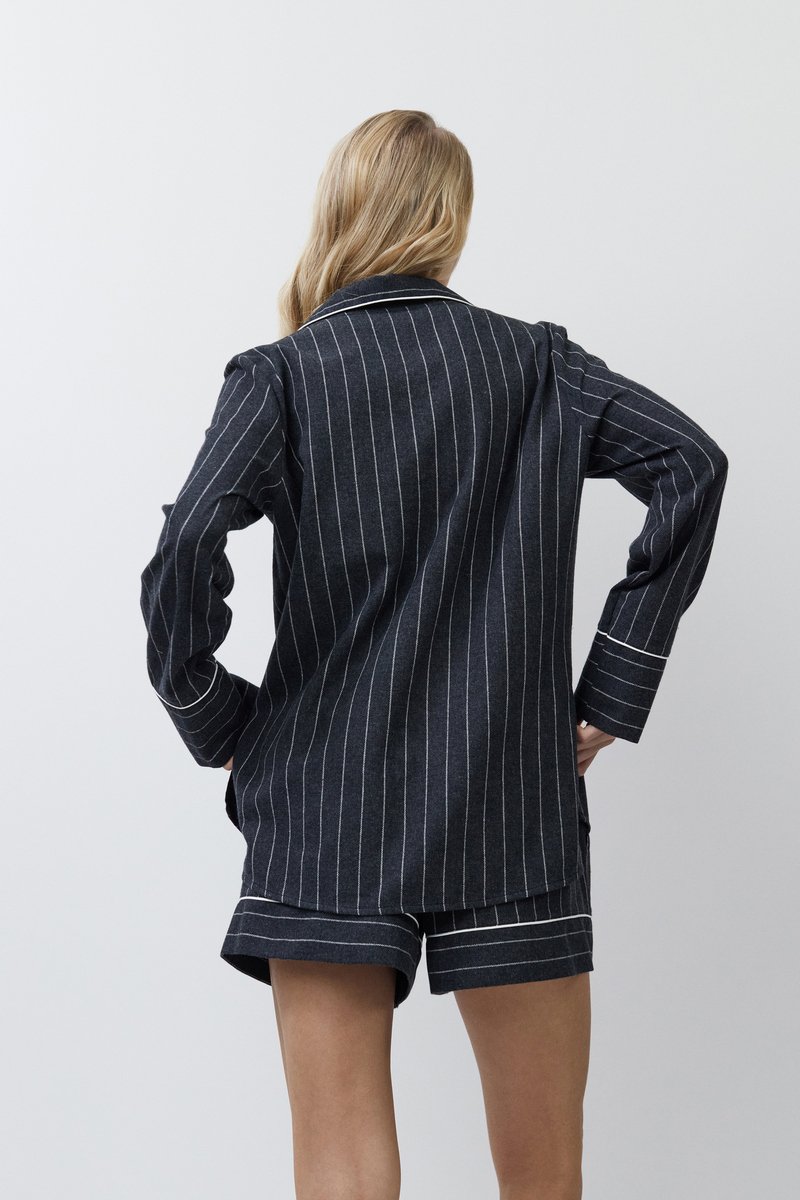 Пижама женская с шортами CASEY для вашего ночного комфорта. Пижама выполнена из хлопковой фланели. Рубашка на пуговицах, с длинными рукавами, отложным воротником и нагрудным карманом. Окантовка дополняет и украшает комплект. Шорты короткие, свободной формы, с эластичным поясом с завязкой и боковыми карманами. Расслабьтесь с максимальным комфортом и стилем в пижаме CASEY.