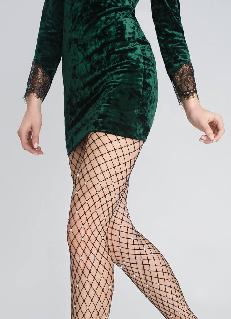 Фантазийные колготки Marilyn Casting Jets в сетку с плетенным соединением верхней и нижней части украшенную кристалами. Верх без шва с тонким поясом - резинкой, без ластовицы, уплотненный носочек.