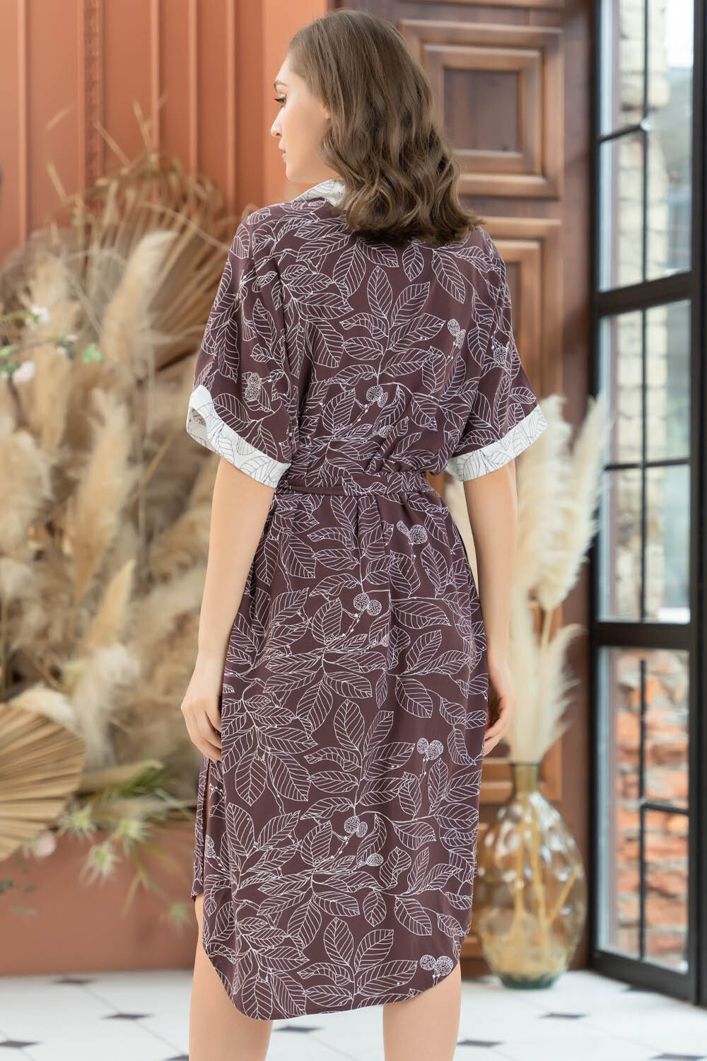 Платье-рубашка Mia-Amore длиной ниже колен с центральной застежкой на пуговицы с цельнокроенными спущенными рукавами выполнена из тёмной принтованной вискозы. По бокам модели разрезы, в боковых швах карманы. По талии силуэт можно подчеркнуть поясом. Манжеты и воротник выполнены из светлого компаньона.