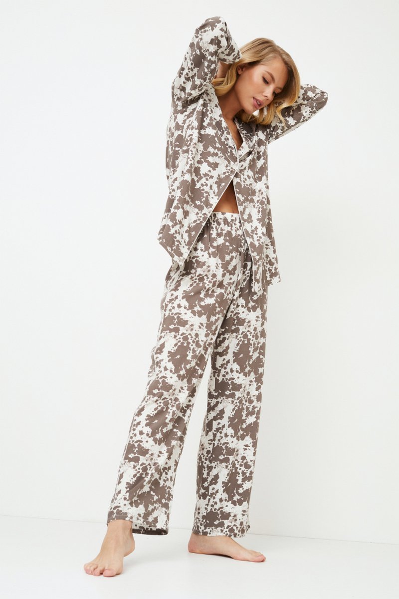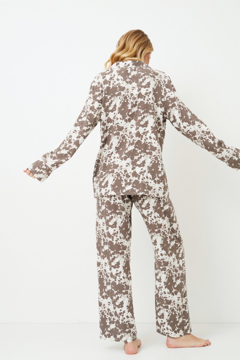 Представляем вашему вниманию пижаму Cinnamon pajama long, которая станет вашим удобным выбором для спокойных ночей и сладких снов. Топ из мягкой вискозы украшен абстрактным рисунком коричнево-кремового цвета. Топ с длинными рукавами и V-образным вырезом горловины, украшенным изящной окантовкой, застегивается на пуговицы. Брюки в тон дополняют комплект, придавая ему непринужденный стиль и максимальный комфорт, украшенный окантовкой по бокам. Насладитесь непринужденным отдыхом в пижаме Cinnamon pajama long, где каждое мгновение - это настоящий релакс. Ткань - вискоза.