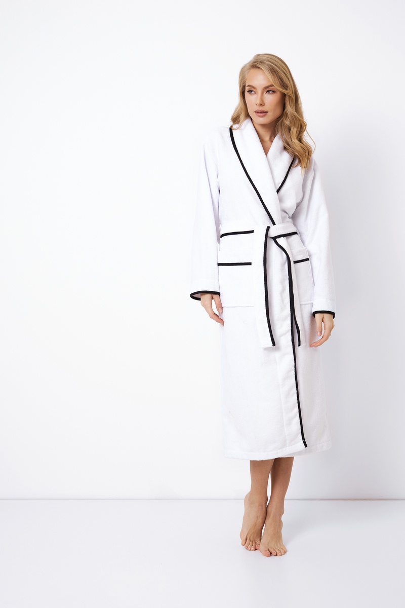 Простота и элегантностость - отличный выбор для любительниц современной классики. Халат Даниэла дополнен с удобными карманами и поясом на талии. Воротник, манжеты, карманы и пояс украшены контрастной черной отделкой. Длина - ниже колена.
