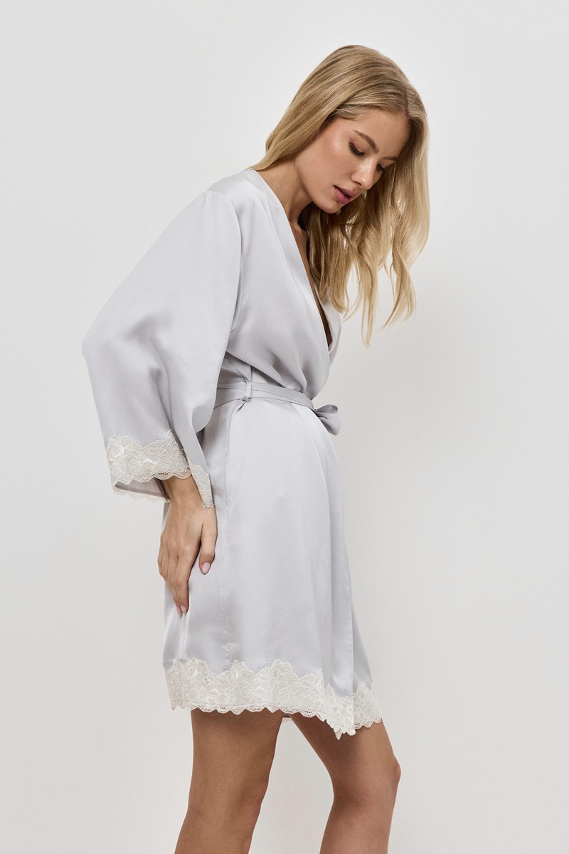 Нежный женский халат EDEN. Выполнен из атласной шелковистой вискозы. Халат короткий, с поясом на запах, свободные длинные рукава, декорирован кружевом.