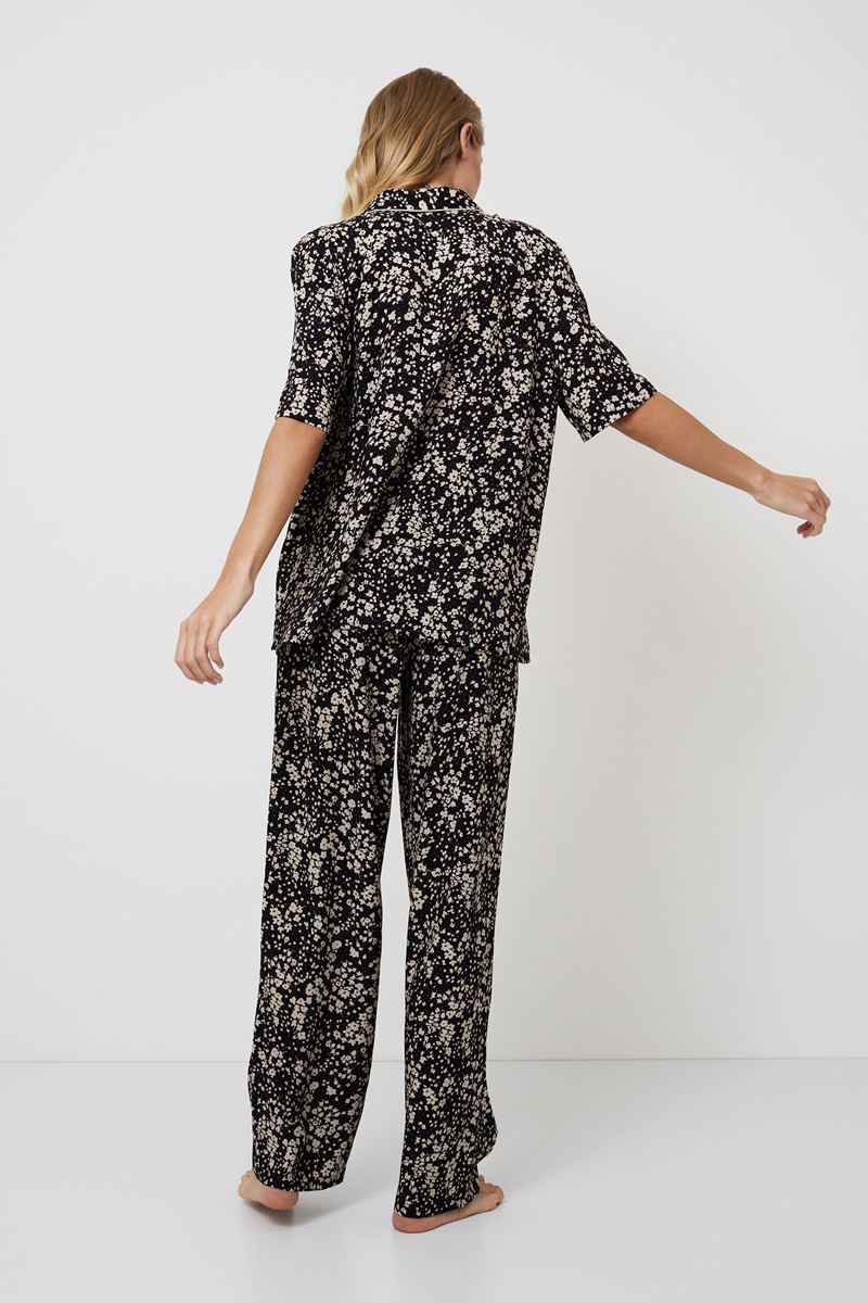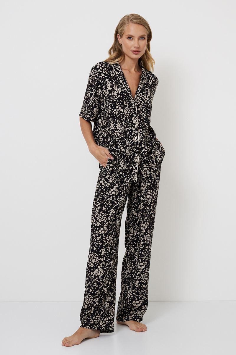 Представляем вашему вниманию длинную пижаму Elaina — изысканное сочетание стиля и комфорта, выполненное из лёгкой вискозы с утончённым цветочным принтом. Рубашка на пуговицах, руков длиной до локтя, украшена V-образным вырезом и бежевой окантовкой по передней части воротника. Дополняют рубашку широкие брюки с эластичным поясом, регулируемый бант обеспечивает индивидуальную посадку. Удобные карманы, украшенные шикарной бежевой окантовкой, добавляют функциональности и стиля. Идеально подходит для тех, кто ищет в вечернем наряде одновременно элегантность и комфорт.