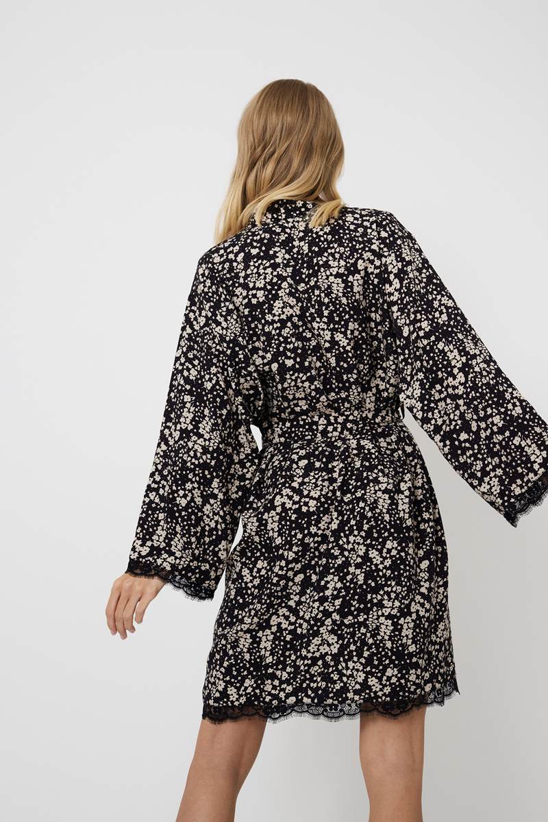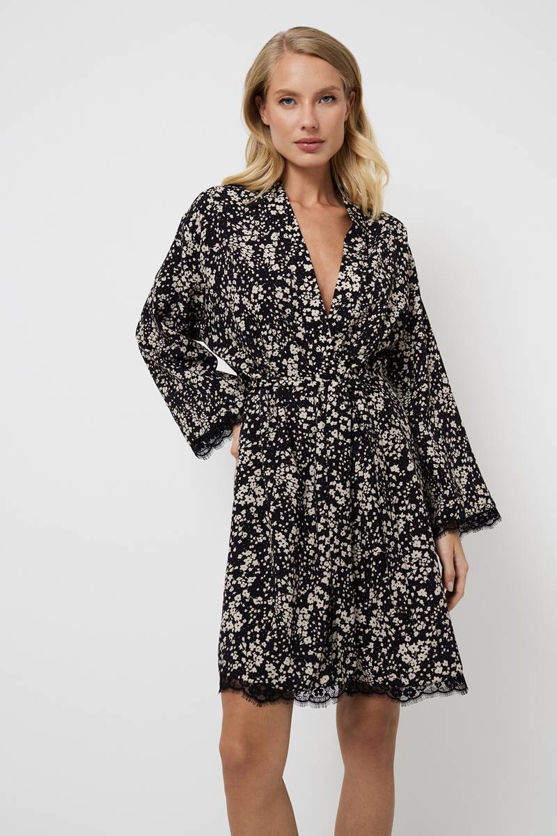 Представляем вам женский халат Eli — потрясающее сочетание элегантности и женственности. Создан из лёгкой вискозы с изысканным цветочным узором. Этот изысканный халат с длинными рукавами, украшен замысловатыми чёрными кружевными деталями вдоль рукавов и нижнего края, что придаёт дизайну нотку романтики. Халат Eli, идеально подходит для любого случая, окутает вас изящной изысканностью и роскошным комфортом, и вы будете чувствовать себя великолепно.
