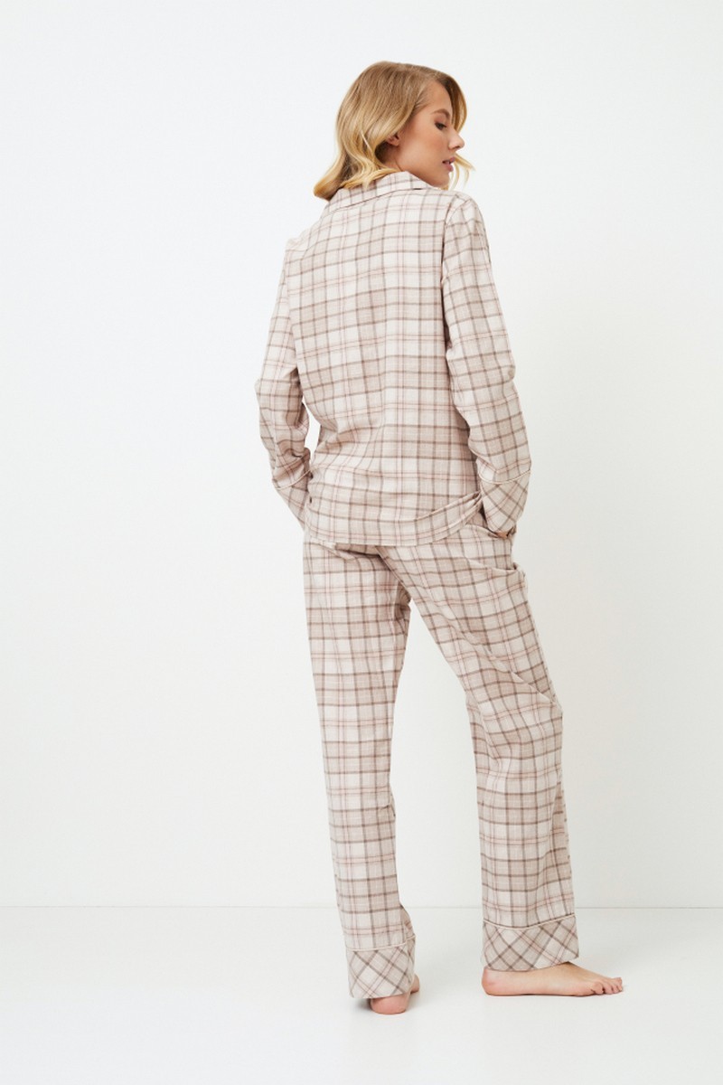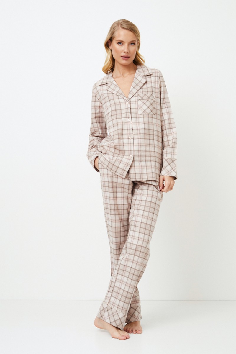 Elsie pajama long - это комплект из мягкого хлопка в приглушенную коричнево-бежевую клетку. Верх представляет собой рубашку на пуговицах с длинными рукавами, V-образным вырезом горловины и нагрудным карманом. Брюки украшены регулируемым бантом на талии и боковыми карманами. Нагрудный карман, манжеты рукавов и низ брюк украшены тонкой окантовкой. Пижамный комплект сочетает в себе комфорт и стиль. Длинная пижама Elsie — это не просто обычная одежда для сна, это ваш билет к непревзойденному уюту и стилю, превращающий вашу ночную рутину в модное приключение! Ткань хлопок фланель.