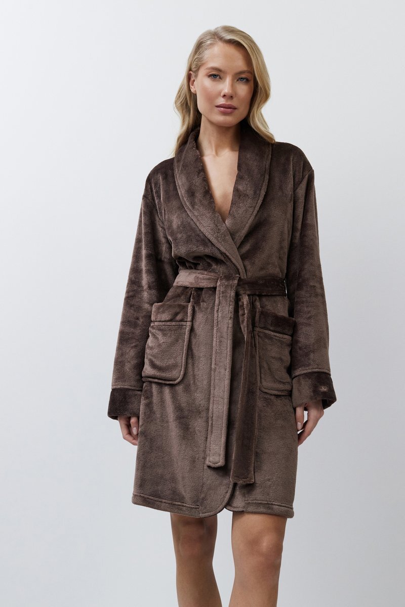 Расслабьтесь с комфортом в этом мягком и деликатном халате Eva. Халат изготовлен из чрезвычайно мягкой и деликатной флисовой ткани. Нижние края халата и карманы закруглены. Воротник, манжеты и карманы украшены изящной атласной окантовкой. И в довершение всего на манжете рукава вышита маленькая блестящая корона, потому что кому не нужна нотка королевского шика в одежде для отдыха?