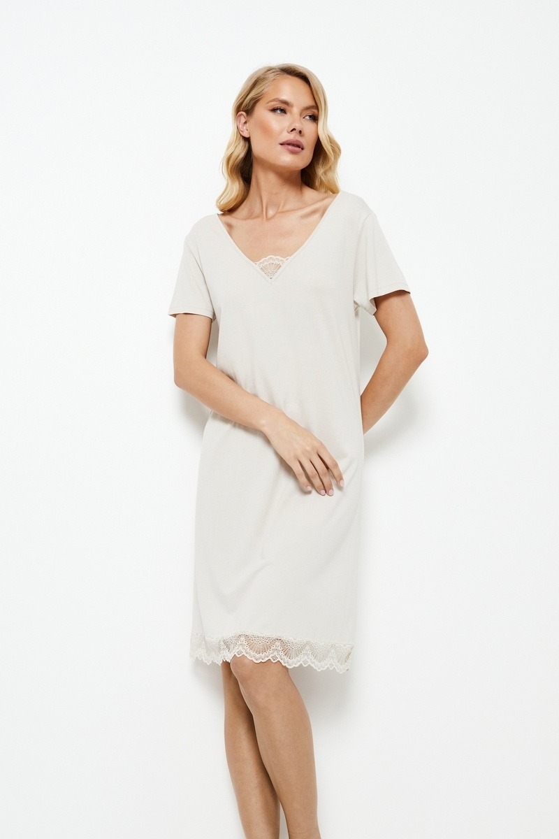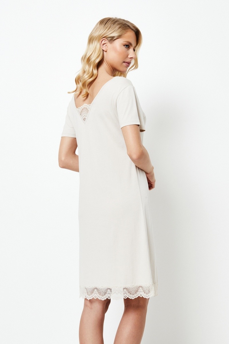 Почувствуйте элегантность и женственность в ночной сорочке Evelyn, изготовленной из мягкой трикотажной хлопково-модальной ткани. Ночная сорочка имеет соблазнительный v-образный вырез спереди и сзади, каждый из которых элегантно обрамлен нежным кружевом, придающим нотку изысканности. Модель с короткими рукавами обеспечивает комфорт и легкость, даря свободу движений. Низ ночной сорочки украшен кружевом. Идеально подходит для тех, кто ценит нотку комфорта в своей ночной одежде. Легко сочетайте ее с халатом Evelyn!
