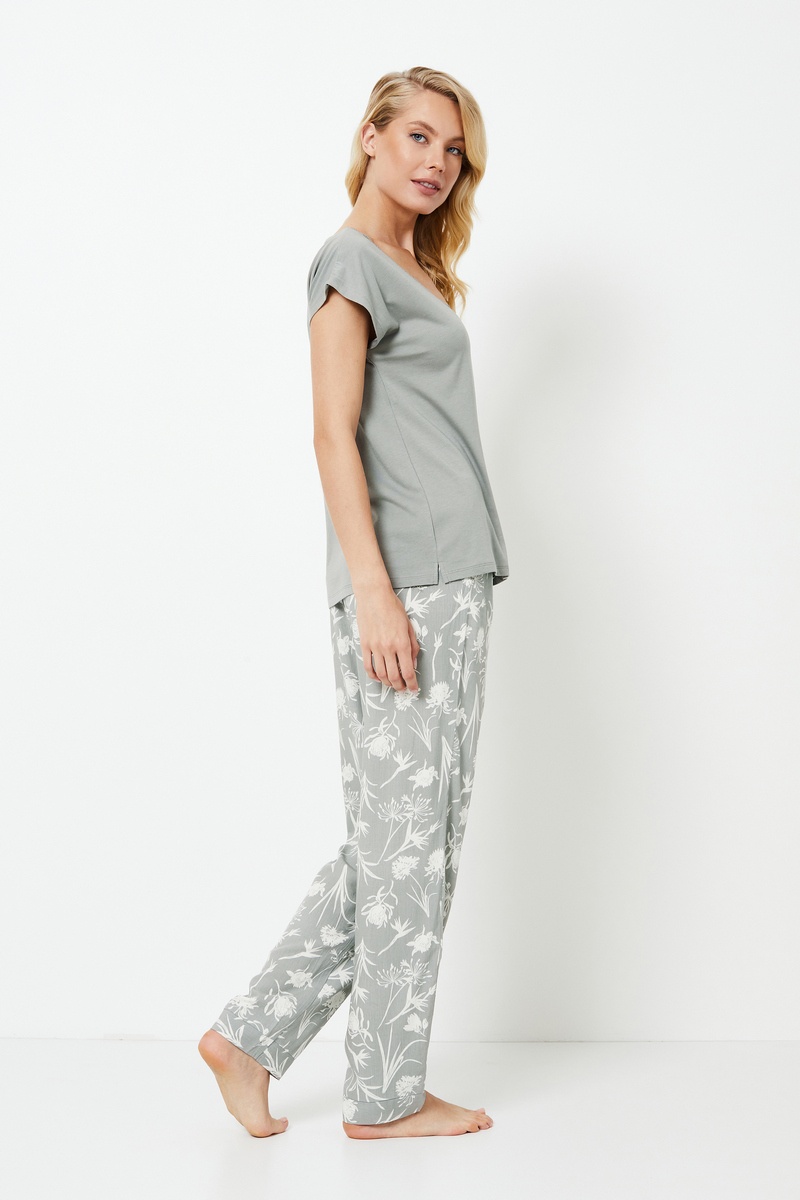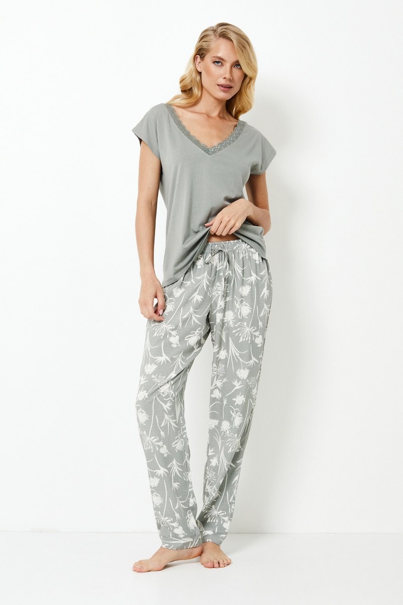 Этот комплект идеально подходит для тех, кто ценит гармоничное сочетание неподвластной времени моды и уютного досуга. Топ с короткими рукавами, выполненный из смеси хлопка и модала, украшен v-образным вырезом, элегантно отделанным тонким кружевом, сочетающим комфорт с шикарным дизайном. Он выполнен в спокойном приглушенном зеленом цвете с оливковым оттенком, излучающем ощущение спокойствия. Брюки, которые завязываются на талии для индивидуальной посадки, завершают образ в том же спокойном зеленом оттенке. Они изящно украшены изысканным цветочным узором, добавляющим элемент изящного стиля в общий ансамбль.