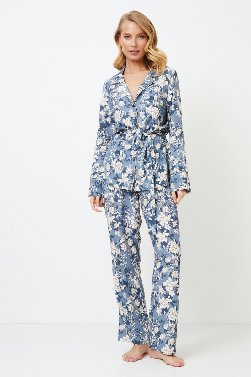Представляем длинную пижаму Francine, в которой цветочная элегантность превращается в блаженство перед сном. Пижама изготовлена из легкой вискозы, что обеспечивает комфорт и воздухопроницаемость в течение всей ночи. Топ с длинными рукавами и поясом застегивается на пуговицы, имеет привлекательный V-образный вырез горловины и манжеты рукавов, украшенные кантом. Брюки классического кроя с удобными карманами. Выполненный в спокойном нежно-голубом цвете с очаровательным цветочным рисунком, этот комплект привнесет красоту сада в ваш спокойный сон. Влюбитесь в чарующее очарование длинной пижамы Francine, идеально подходящей для того, чтобы заснуть в объятиях природы.