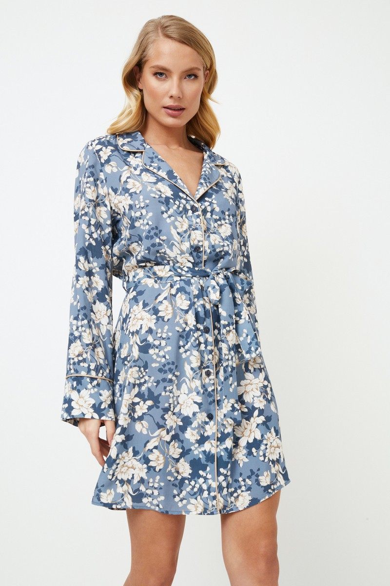 Представляем ночную рубашку Francine, в которой цветочная элегантность превращается в блаженство перед сном. Ночная рубашка изготовлена из легкой вискозы, что обеспечивает комфорт и воздухопроницаемость в течение всей ночи. Ночная рубашка с поясом и длинными рукавами застегивается на пуговицы, имеет привлекательный V-образный вырез горловины и манжеты рукавов, украшенные кантом. Этот комплект, выполненный в спокойном нежно-голубом цвете с очаровательным цветочным узором, привнесет красоту сада в ваш спокойный сон. Влюбитесь в чарующее очарование ночной рубашки Francine, идеально подходящей для того, чтобы заснуть в объятиях природы.
