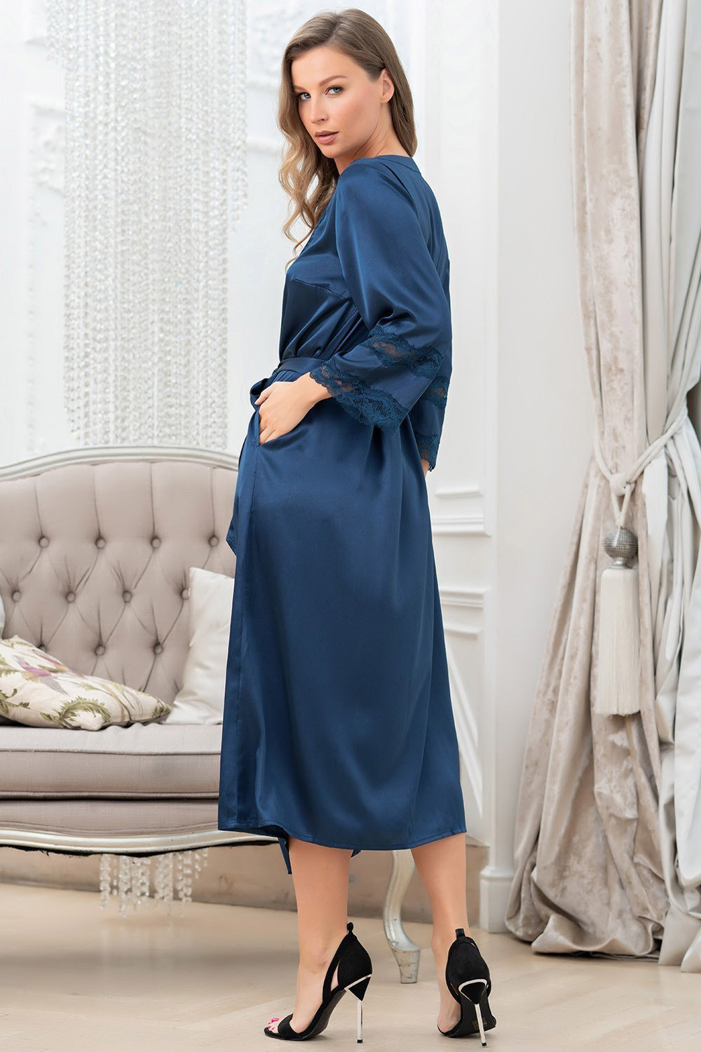 Длинный халат Mia-Amore на пуговицах с рукавом длиной 7/8, выполнен из однотонного смесового шелка и декорирован кружевными вставками по вырезу и низу. В боковых швах обработаны карманы. Линию талии можно подчеркнуть за счет широкого пояса, который идет в комплекте.