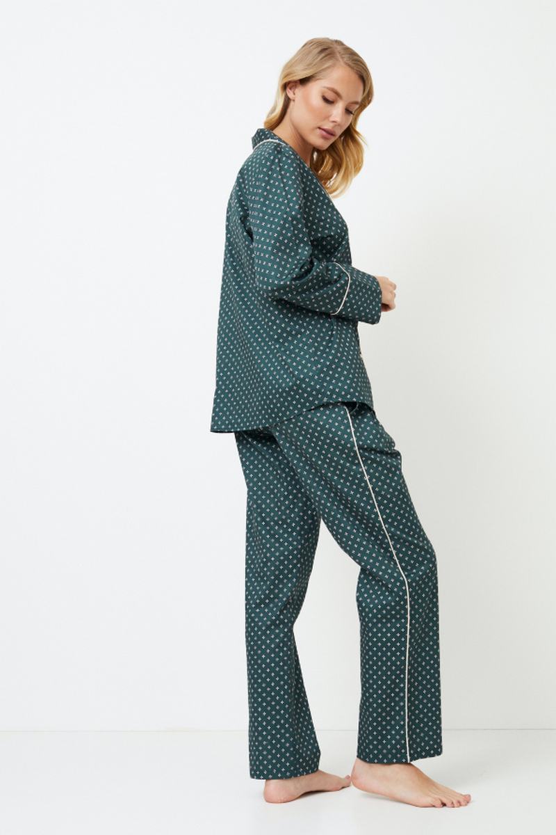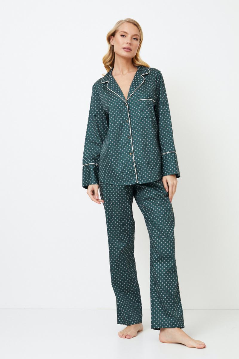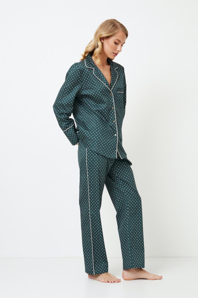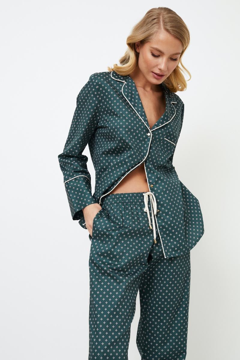 Представляем длинную пижаму Genny, великолепный выбор для вашего ночного комфорта. Пижама выполнена из блестящей хлопчатобумажной ткани изумрудно-зеленого цвета с роскошным геометрическим рисунком. Рубашка на пуговицах с длинными рукавами, облегающим V-образным вырезом горловины, нагрудным карманом, золотистыми пуговицами и белоснежной окантовкой вдоль кармана, воротника, передней части и манжет рукавов. Брюки с потайными карманами, окантовкой в тон по бокам и регулируемой талией с золотистыми вставками на манжетах. Соедините его с длинной пижамой Gabriel, чтобы получить идеальный комплект, идеально подходящий для уютных вечеров с вашим партнером. Изделие выполнено из шелковистого текстильного хлопка.