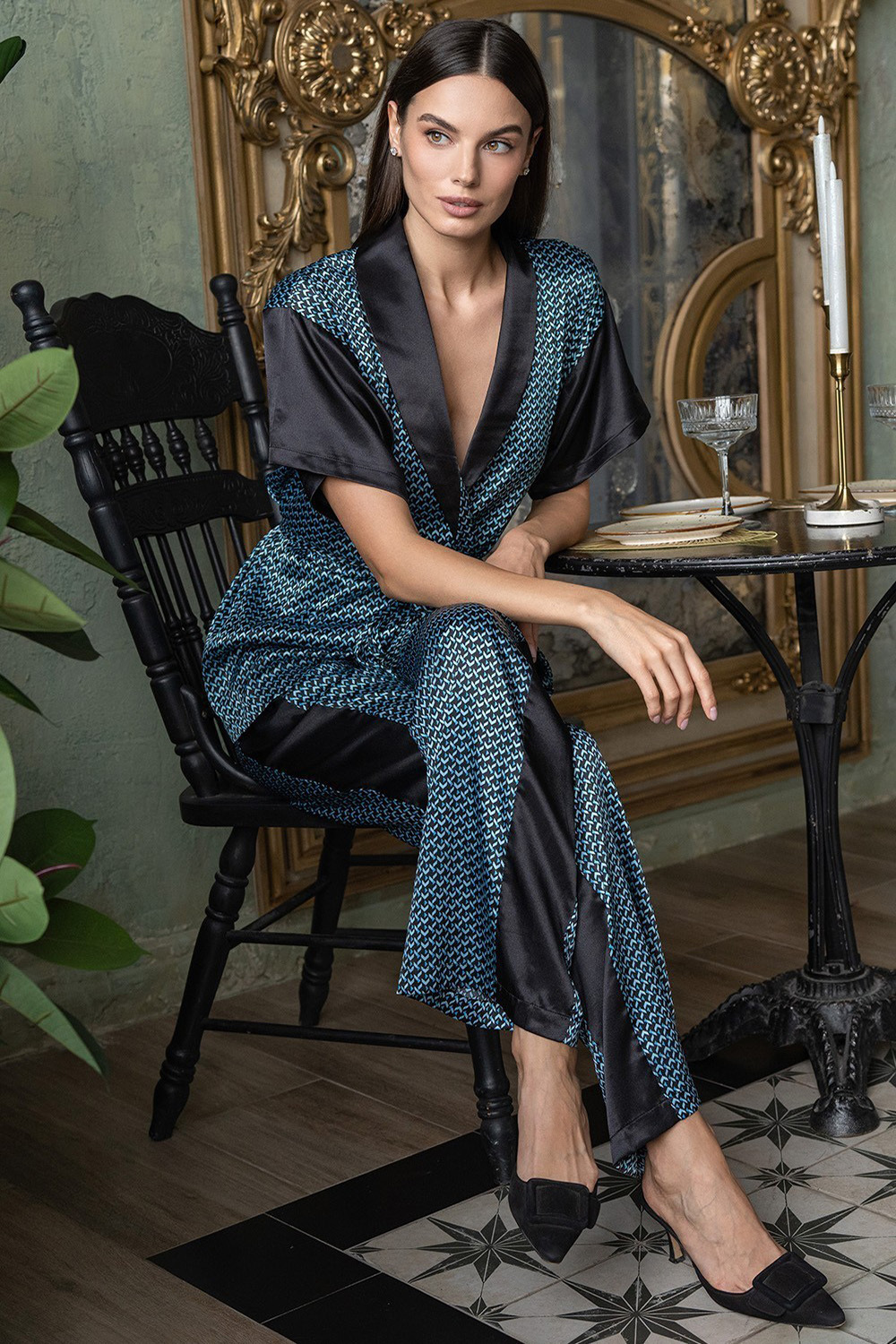 Комплект Mia-Amore состоит из запашного жакета с короткими рукавами и брюк прямого силуэта, комплект выполнен из принтованного искусственного шелка. Оригинальные рукава жакета выполнены из однотонного искусственного шелка. Горловину жакета украшает воротник по типу шальки, выполненный также из однотонного искусственного шелка. Боковые швы брюк декорированы однотонными вставками. В комплекте идет пояс. В боковых швах брюк расположены карманы.
