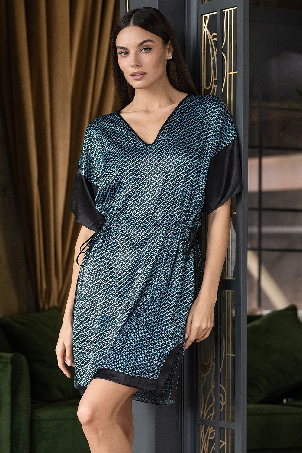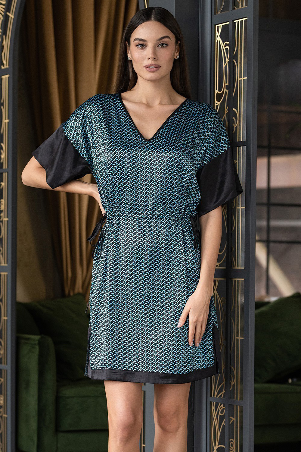 Укороченная туника Mia-Amore со спущенными плечами выполнена из принтованного искусственного шёлка. Рукава и низ туники отделаны однотонным искусственным шёлком. По центру воротника декоративная застежка на молнию. В боковых швах есть карманы. В комплекте идет пояс.