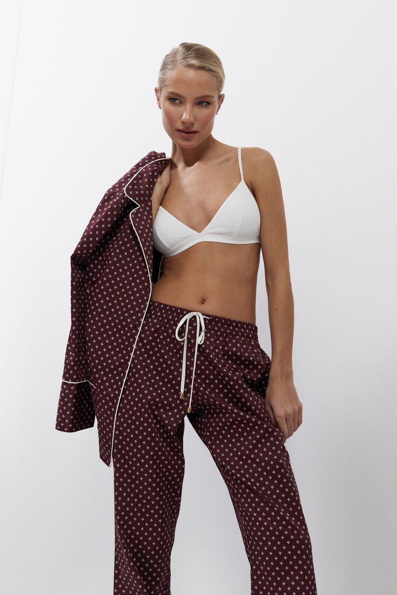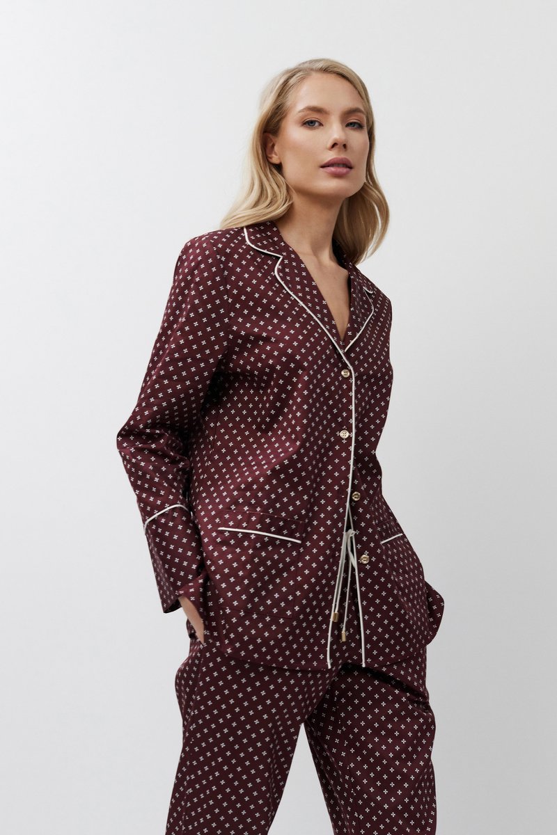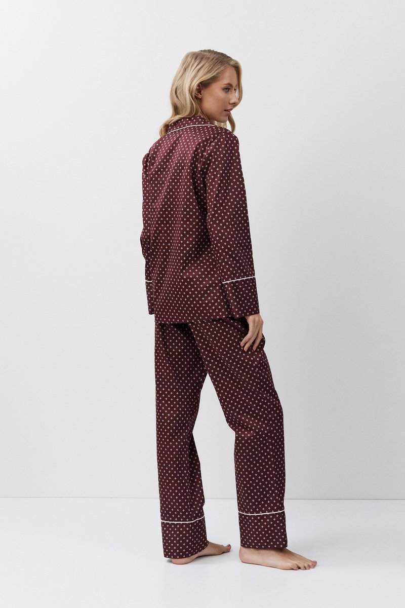 Пижама женская со штанами GEORGETTE, идеальный вариант для ночного отдыха. Рубашка с длинными рукавами, на пуговицах, c V-образным вырезом горловины и нагрудным карманом с левой стороны. Окантовка дополняет и украшает комплект. Штаны длинные, комфортной посадки, с боковыми карманами, эластичный пояс со шнурком. Изделие выполнено из шелковистого текстильного хлопка.