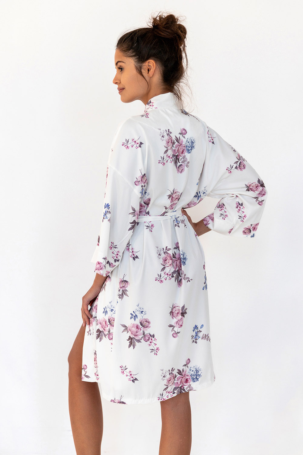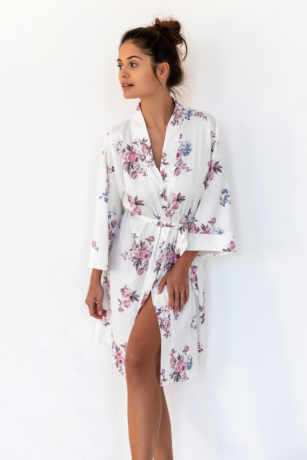 Атласный запашной халат Lucretia с длинными рукавами, декорирован очаровательным цветочным принтом. В комплекте идет пояс. Идеальный вариант для домашнего отдыха.