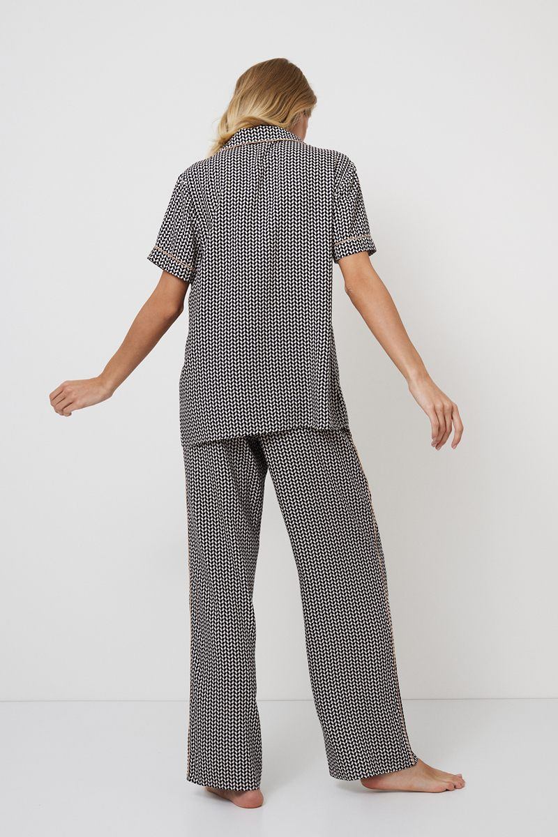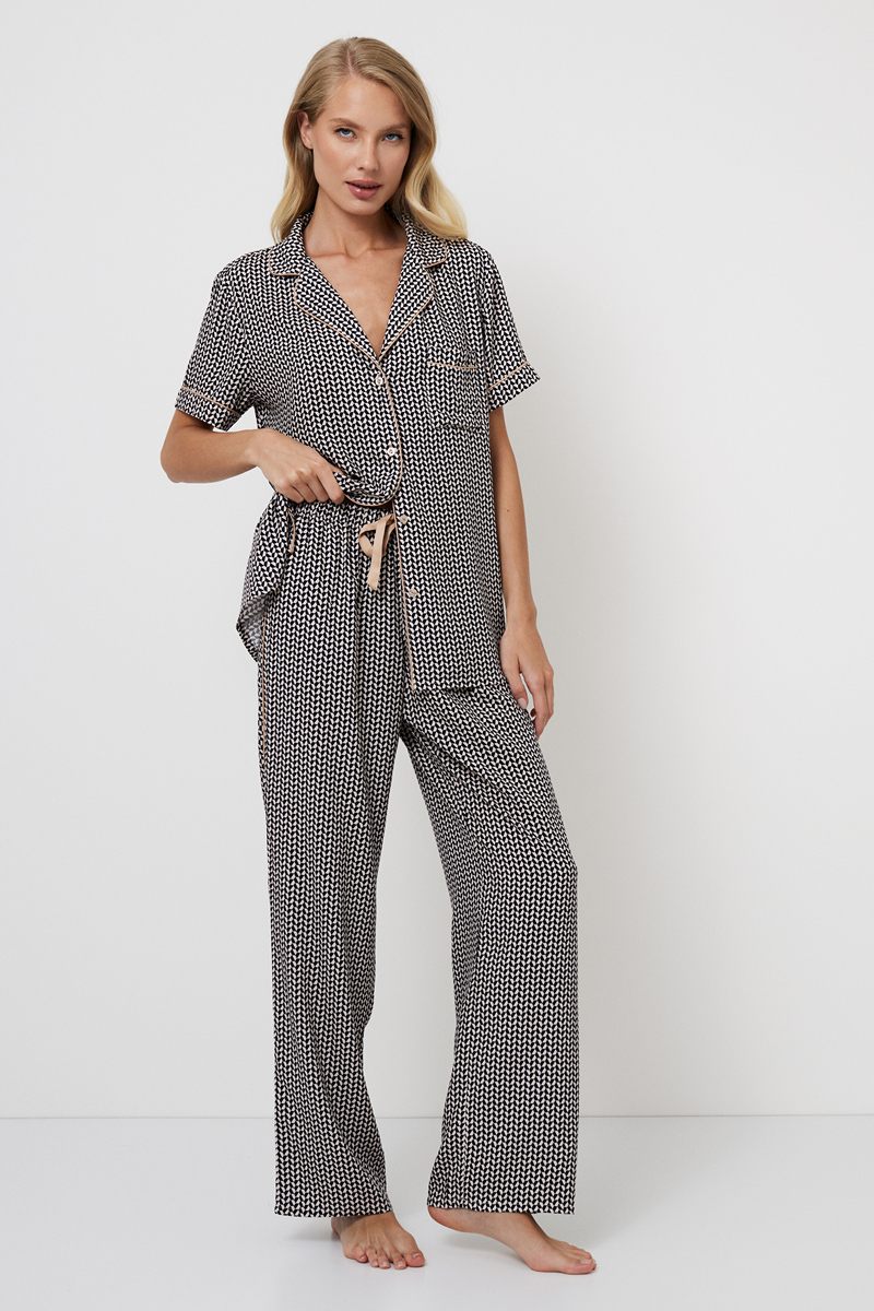 Представляем вашему вниманию потрясающую пижаму Isolda, в которой каждая деталь продумана до мелочей. Этот комплект, изготовленный из лёгкой вискозы с очаровательным геометрическим узором, обеспечивает непревзойденный комфорт и воздухопроницаемость. Рубашка на пуговицах, с короткими рукавами, может похвастаться шикарным V-образным округлым воротником и нагрудным карманом для дополнительного стиля. Рубашка дополнена карамельными вставками на воротнике спереди, нагрудном кармане и манжетах рукавов, излучая элегантность с каждой строчкой. Брюки с матовой атласной отделкой карамельного цвета, регулируемым поясом-бантом и шикарной окантовкой по бокам и нижнему краю. Благодаря удобным карманам для хранения необходимых вещей, этот комплект сочетает в себе практичность и элегантность. Преобразите свой домашний образ с помощью пижам Isolda и наслаждайтесь вечерами в расслабленной и неподвластной времени элегантности.