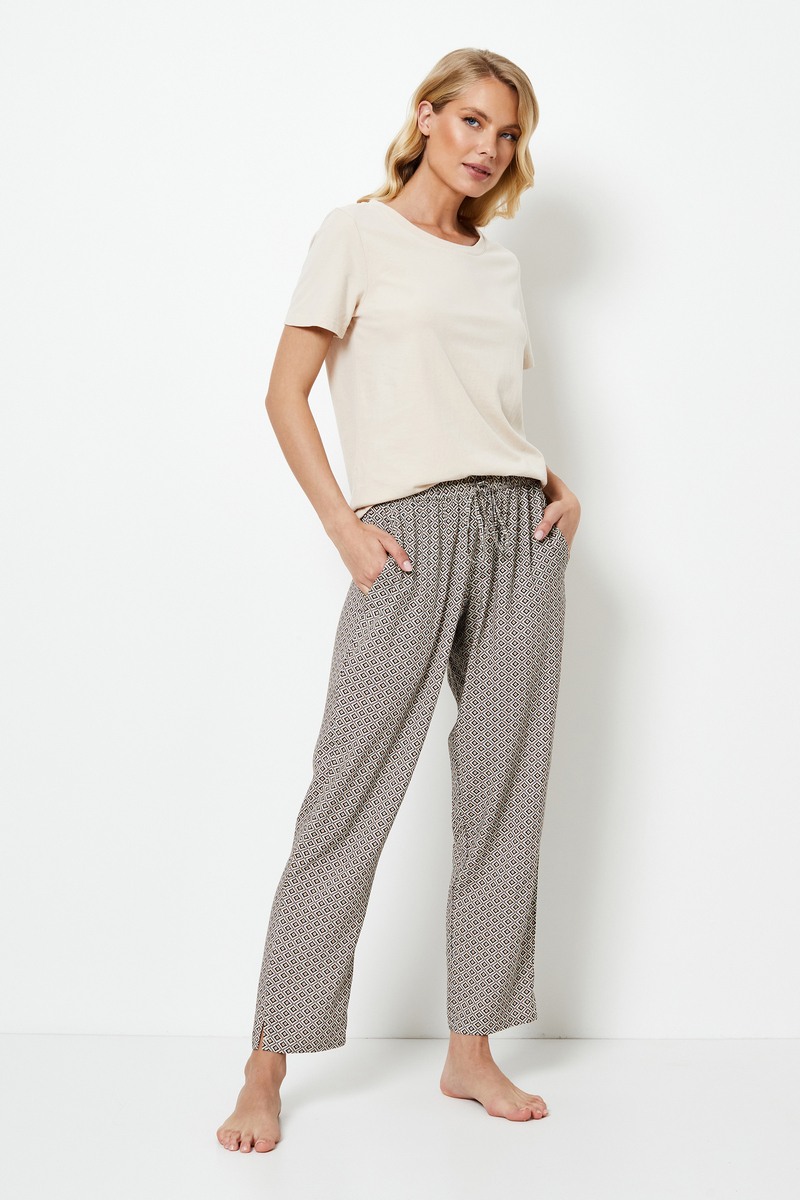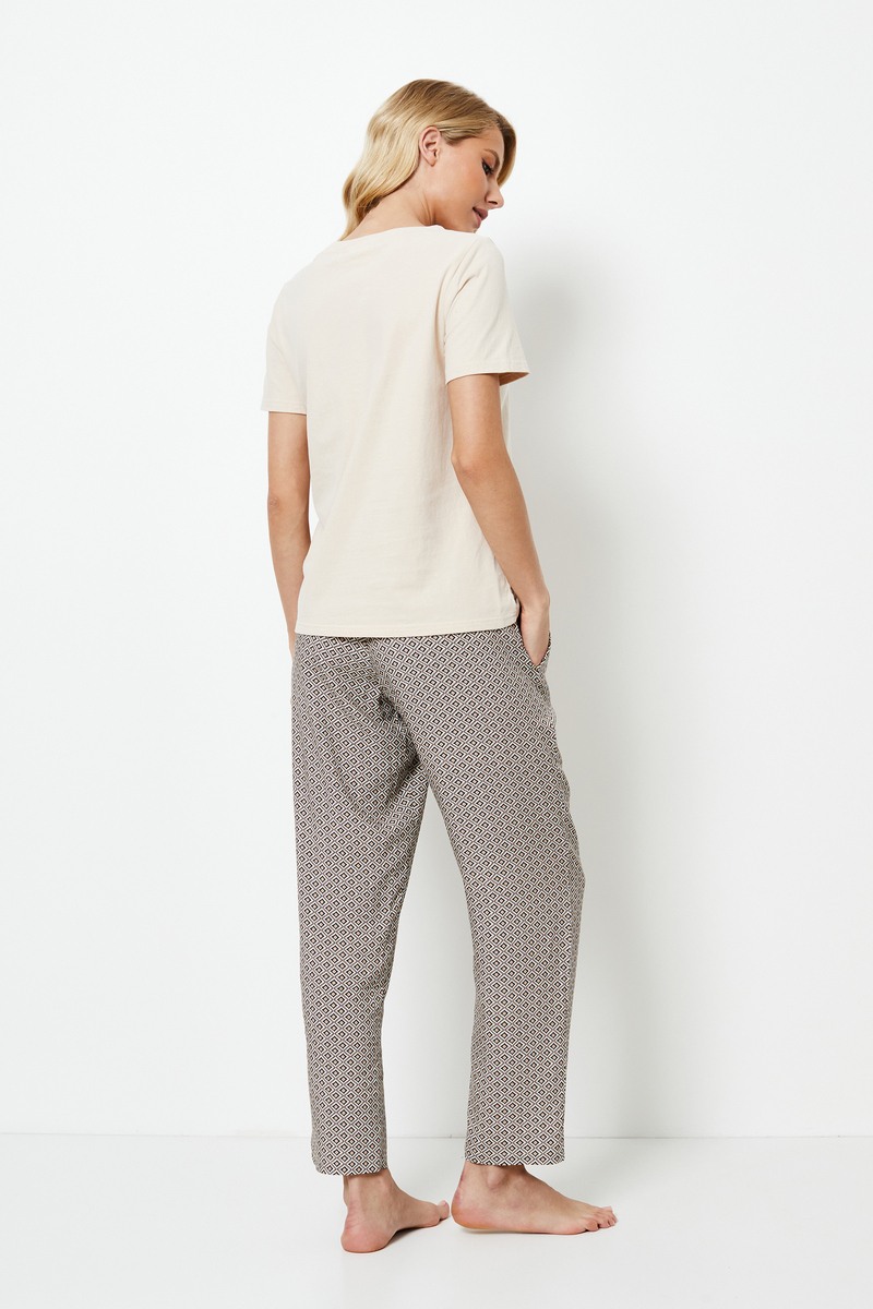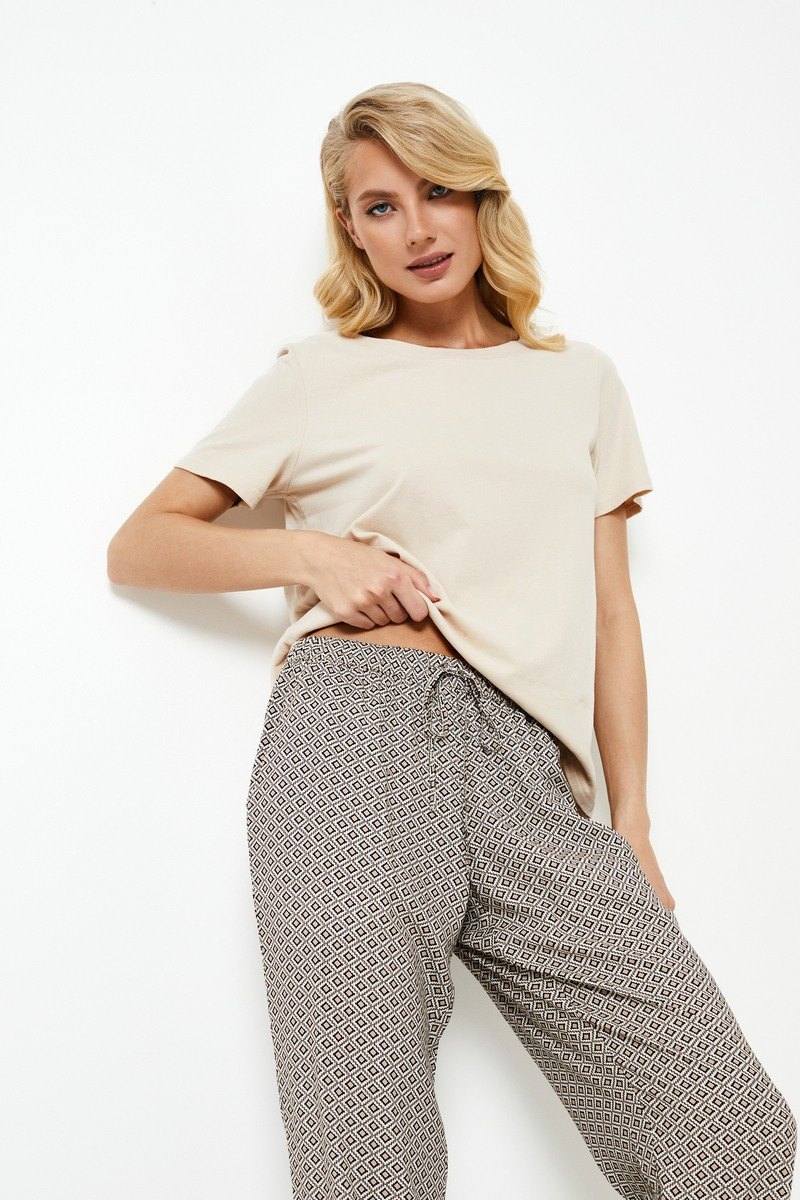 Обновите свой ассортимент одежды для сна с помощью этого уютного пижамного комплекта. Футболка из мягкого хлопка с короткими рукавами выполнена в спокойном песочном оттенке и имеет классический круглый вырез, придающий образу непринужденную простоту. Она дополнена брюками повседневного покроя, завязывающимися на талии, с разрезами по бокам на подоле для создания утонченного стиля. Эта пижама обеспечивает идеальный баланс между комфортом и изысканным шиком.