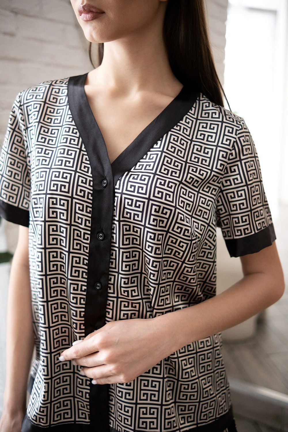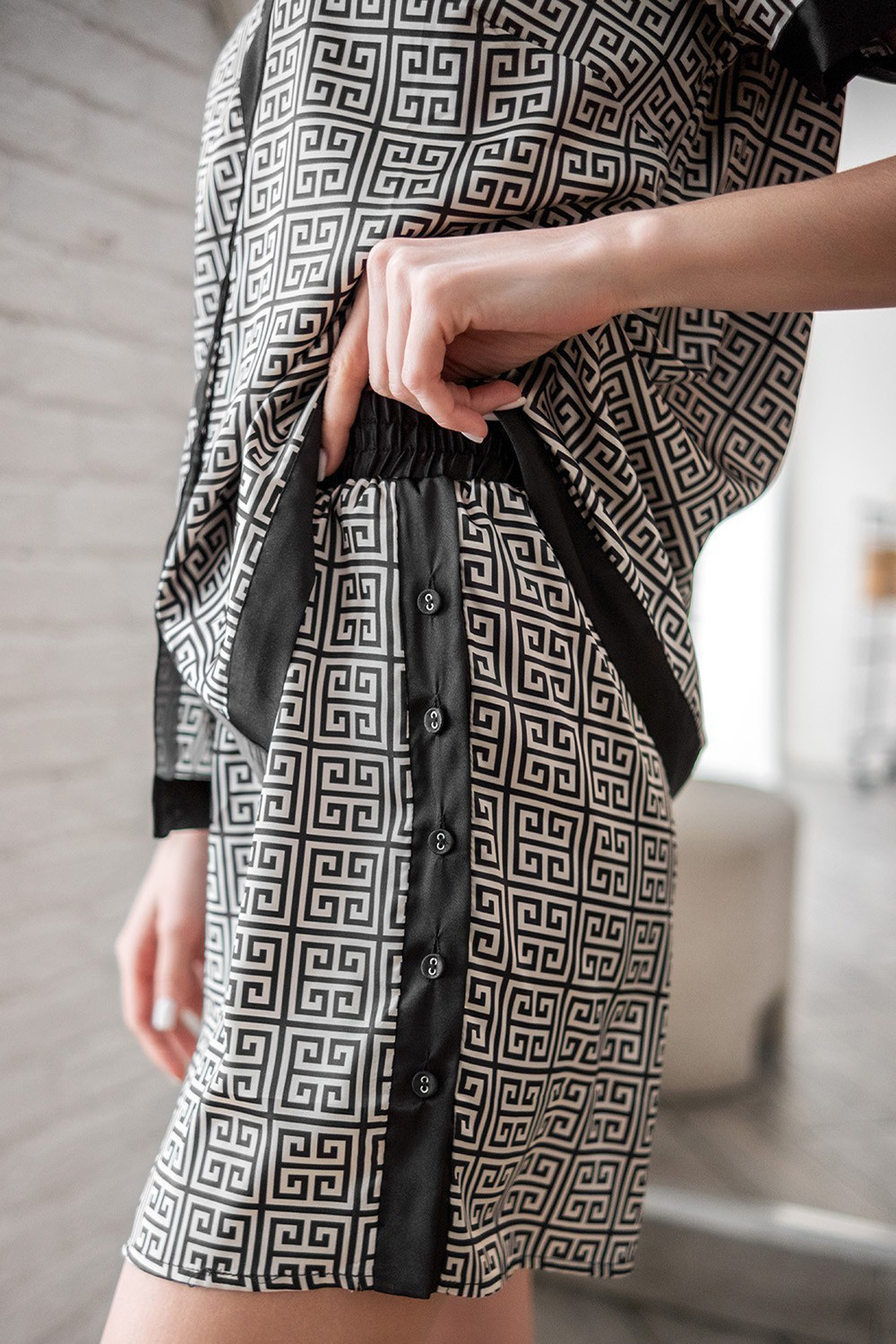 Комплект Mia-Amore состоит из жакета с коротким рукавом и шорт. Комплект выполнен из принтованного смесового шелка с однотонной отделкой. По бокам шорт расположены карманы.