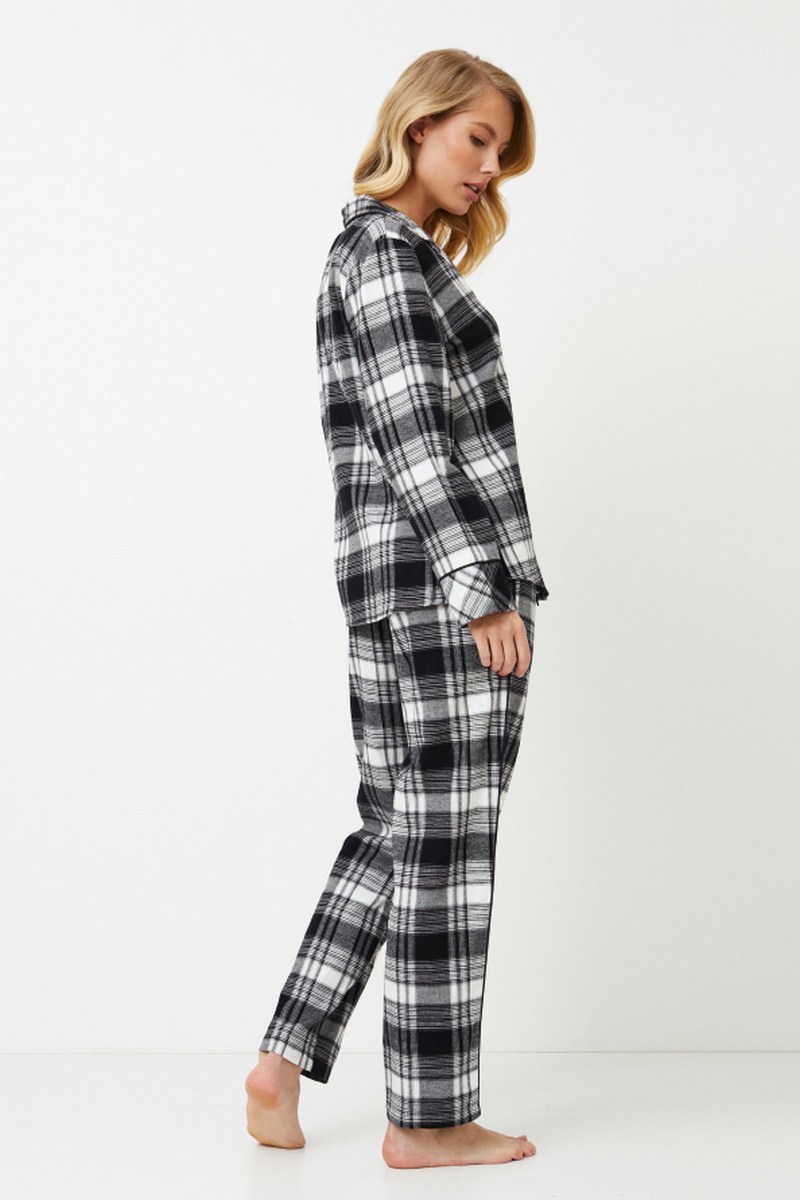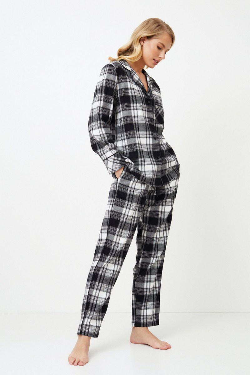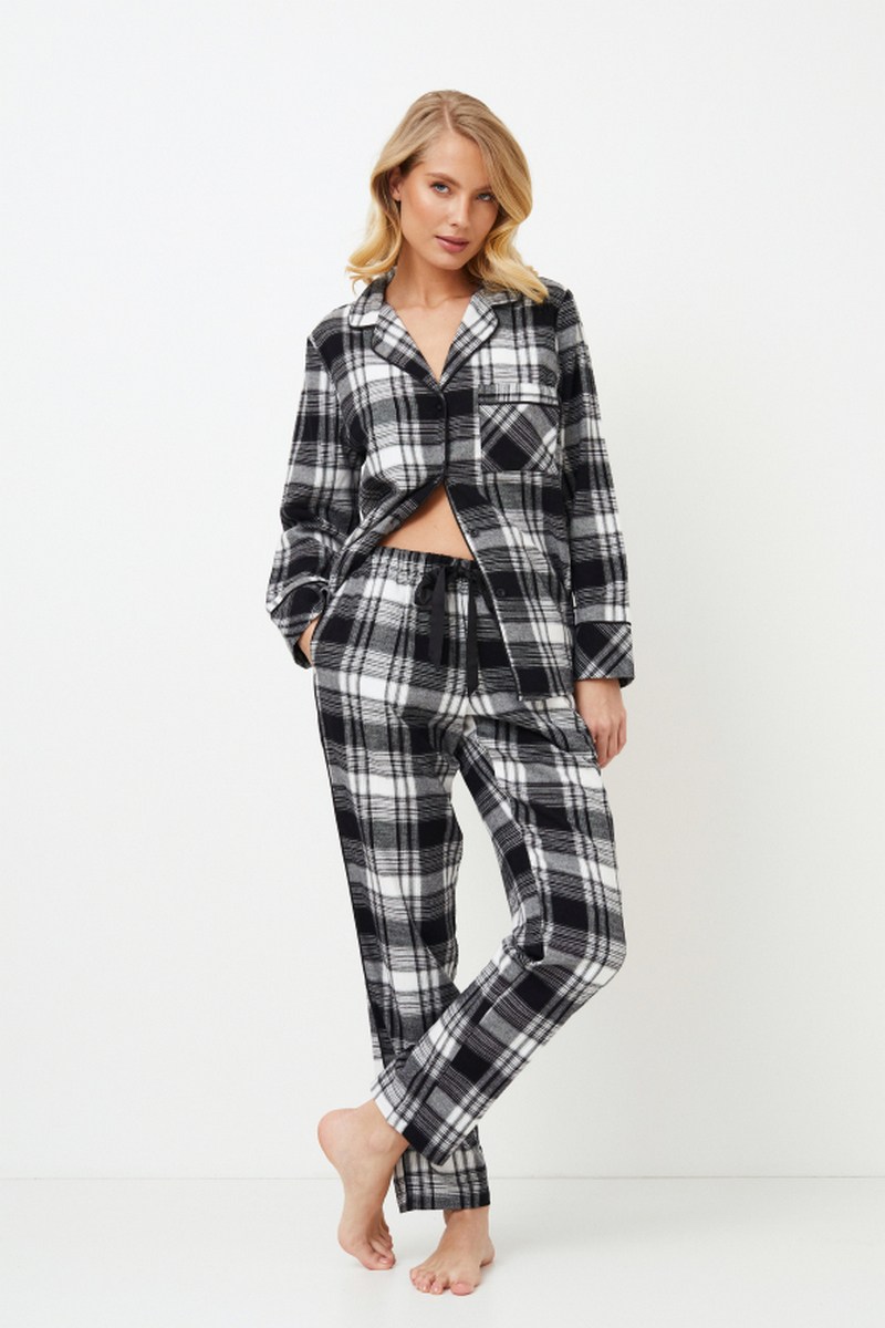 Представляем вашему вниманию длинную пижаму Joan, которая станет незаменимым аксессуаром для прохладных ночей. Пижамный комплект выполнен из фланелевого хлопка в вечную черно-белую клетку. Рубашка с длинными рукавами на пуговицах, стильным v-образным вырезом, нагрудным карманом и манжетами на рукавах, украшенными кантом. Сочетается с брюками классического кроя, завязывающимися на талии, с удобными карманами, элегантной окантовкой по бокам и атласной лентой на талии в тон. Идеально подходит для создания классической зимней атмосферы в свежей цветовой палитре. Не забудьте о комфорте своей второй половинки – возьмите с собой пижаму James pajama long, потому что прижиматься друг к другу вдвойне приятнее! Изделие выполнено из хлопкового фланеля.