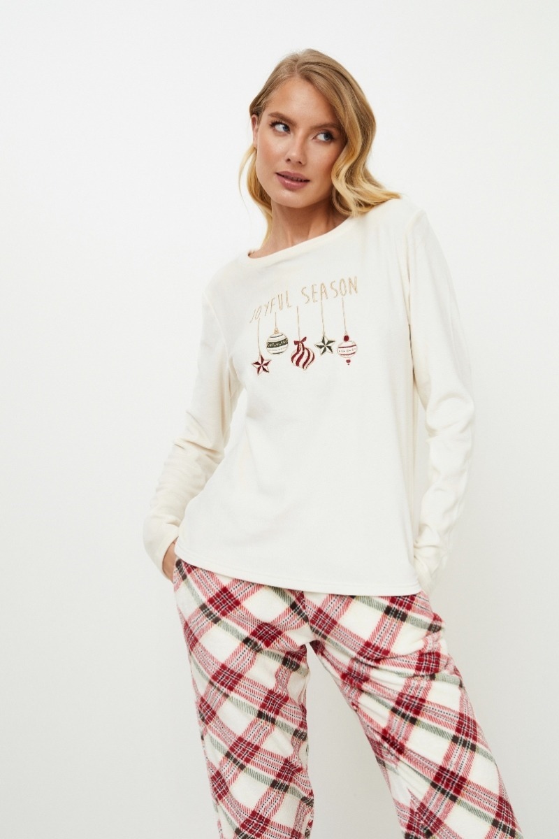 Представляем пижамный комплект Jolly soft, в котором комфорт сочетается с рождественским волшебством. Белая рубашка с длинными рукавами украшена яркой вышивкой "Радостный сезон", которая привносит дух Рождества и навевает воспоминания об уютных праздничных вечерах. В сочетании с брюками классического кроя с ярким рисунком в клетку и удобными карманами. Это идеальный набор для того, чтобы зимним вечером мечтать о леденцовых тросточках и мерцающих огоньках. Материал велсофт (плюш).