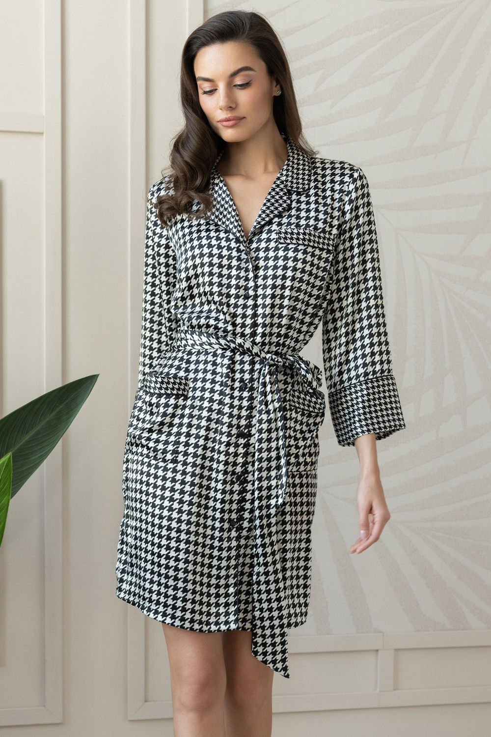 Короткий халат Mia-Amore на пуговицах с рукавом длиной 7/8. Халат выполнен из смесового шелка. В изделии используются два вида масштаба одного принта, граница которых разделена контрастным кантом. По бокам расположены накладные карманы. Линию талии можно подчеркнуть за счет пояса, который идет в комплекте.