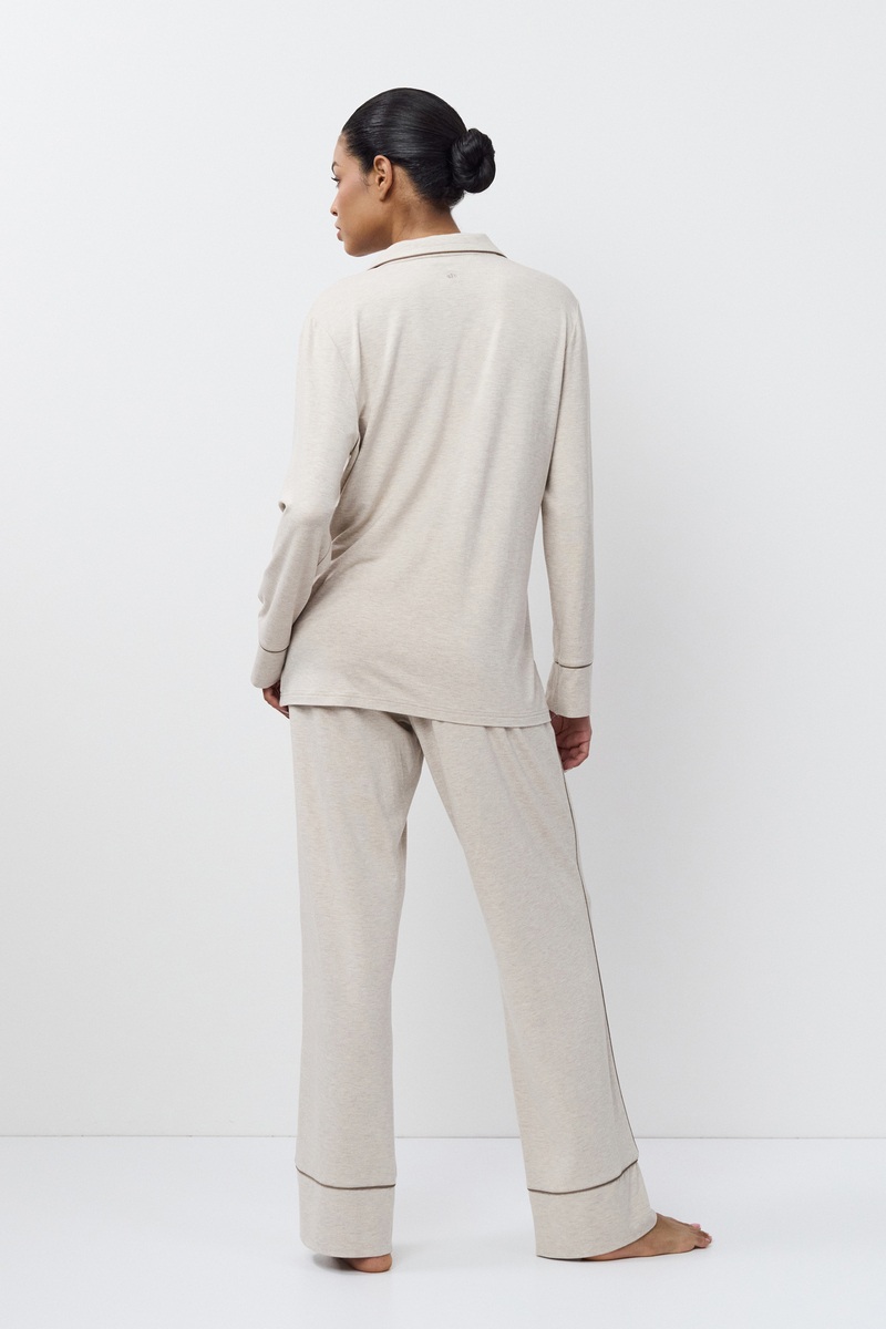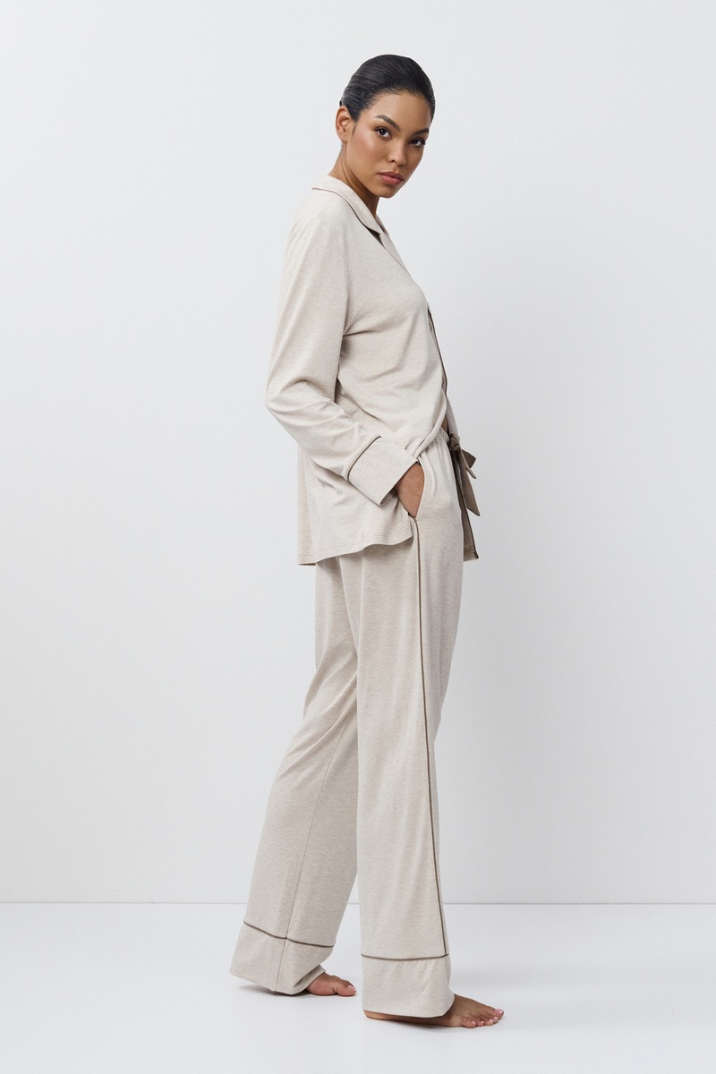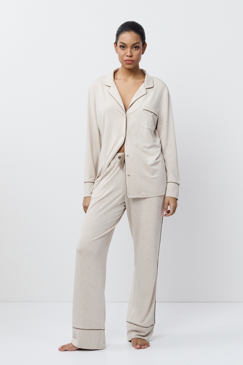 Пижама женская со штанами KARINE для максимального комфорта и расслабления. Выполнена из эластичной вискозы. Рубашка на пуговицах, с отложным воротником и нагрудным карманом, рукава длинные. Штаны длинные, свободные, комфортной посадки, по бокам карманы, пояс эластичный. Окантовка добавляет изысканности изделию. Пижама станет вашим идеальным спутником во время сна.
