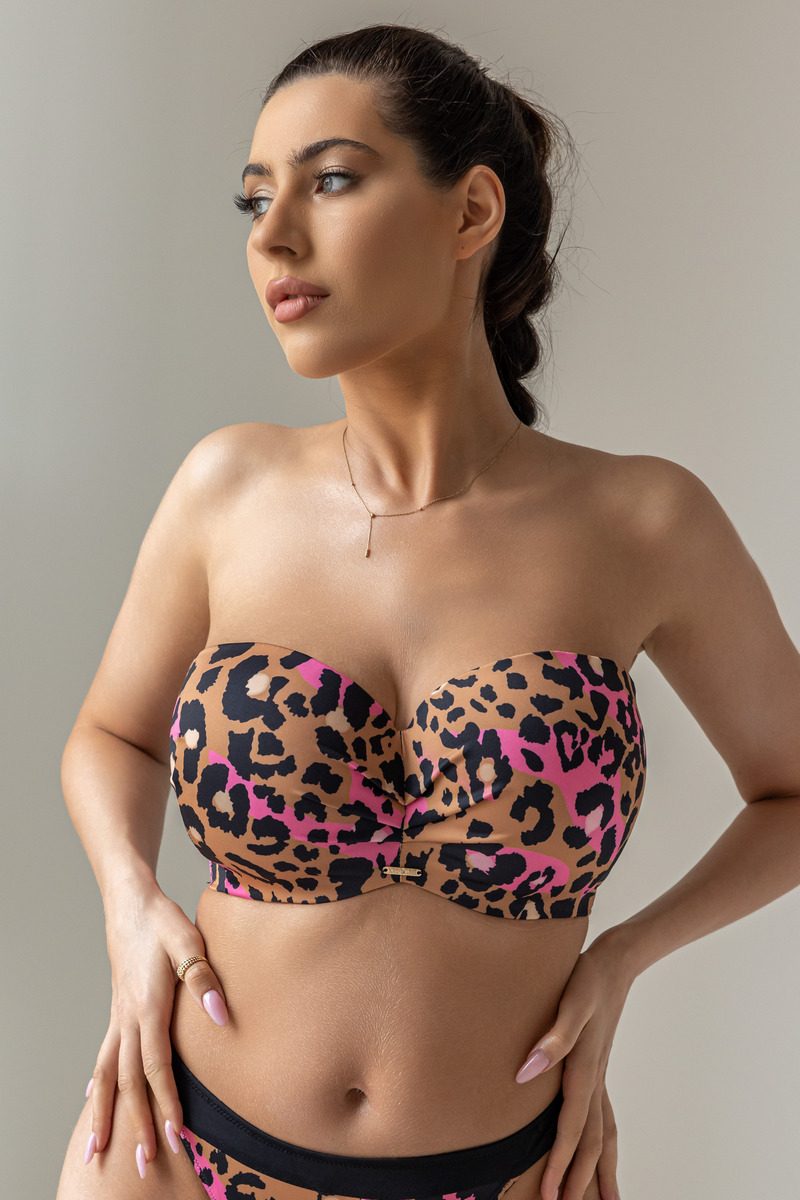 Бюстгальтер KENYA Balconettemhm имеет специально сформированную чашку формы бандо, которая красиво раскрывает и обнажает верхнюю часть груди, поднимая ее вверх и подбирая по бокам, делая грудь более крупной и полной. Чашка тонкий поролон на кости. Предназначен для малых и средних бюстов. Модель со съемными бретелями. Стан с вертикальной костью.