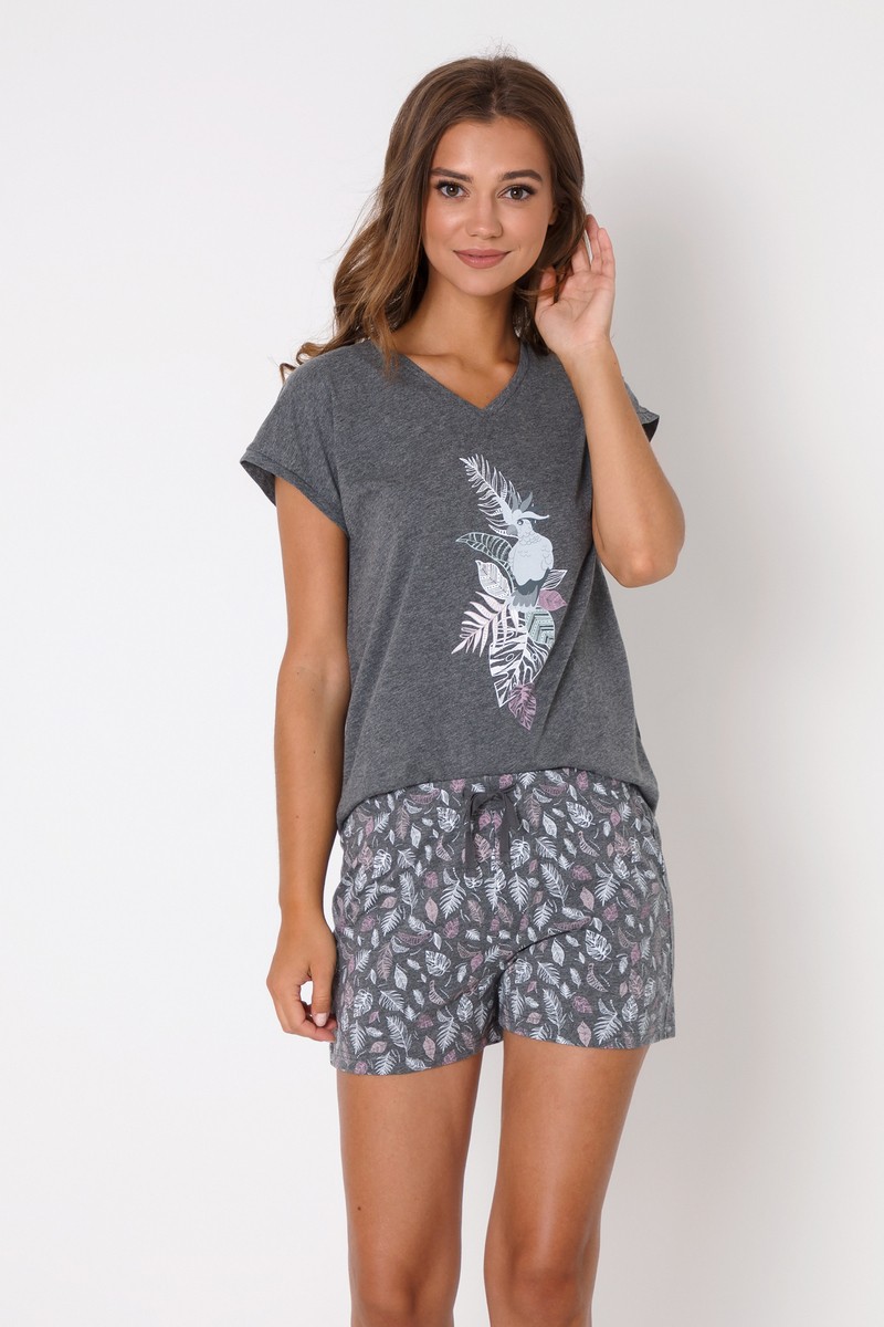 Веселый и удобный пижамный комплект с короткими рукавами какаду - хороший вариант, если вы ищете что-то темное, но в то же время веселое. Пижамный комплект изготовлен из мягкой хлопчатобумажной ткани. Топ с V-образным вырезом и короткими рукавами украшен изображением какаду на груди. Шорты прямого кроя изготовлены из ткани с принтом из перьев и дополнительно завязаны с функциональной регулировкой талии.