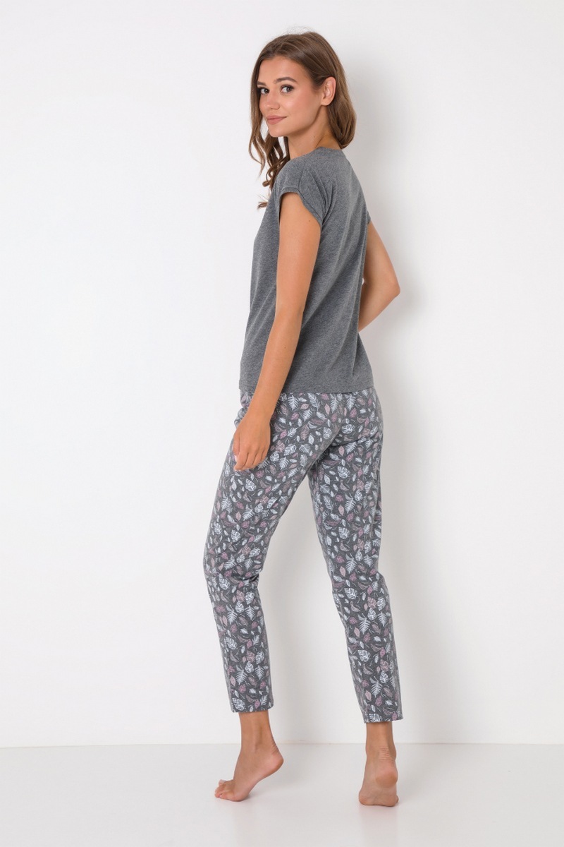 Веселый и удобный пижамный комплект какаду со штанами - хороший вариант, если вы ищете что-то темное, но в то же время веселое. Пижамный комплект изготовлен из мягкой хлопчатобумажной ткани. Топ с V-образным вырезом и короткими рукавами украшен изображением какаду на груди. Брюки укорочены до длины 7/8 и изготовлены из ткани с рисунком из перьев. Брюки дополнительно завязаны с функциональной регулировкой талии.