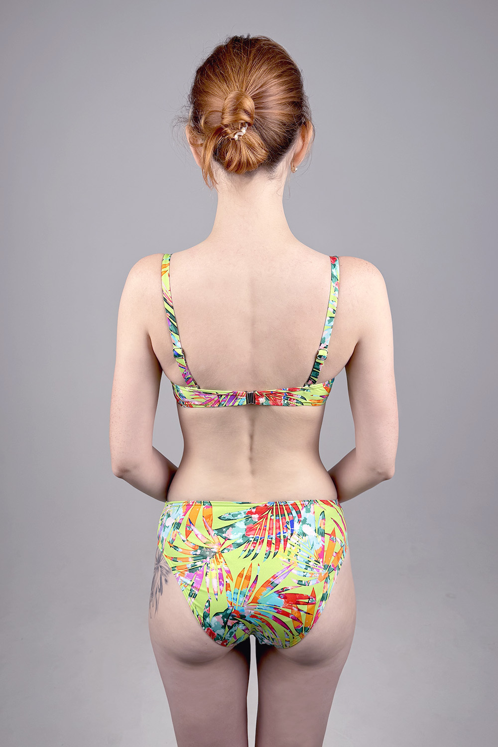 Раздельный купальник Liv желто-зеленого цвета с ярким цветочным принтом. Чашка push-up на косточках. Бретели отстегиваются и регулируются по длине, металлическая застежка на спине не регулируется. Плавки средней посадки.