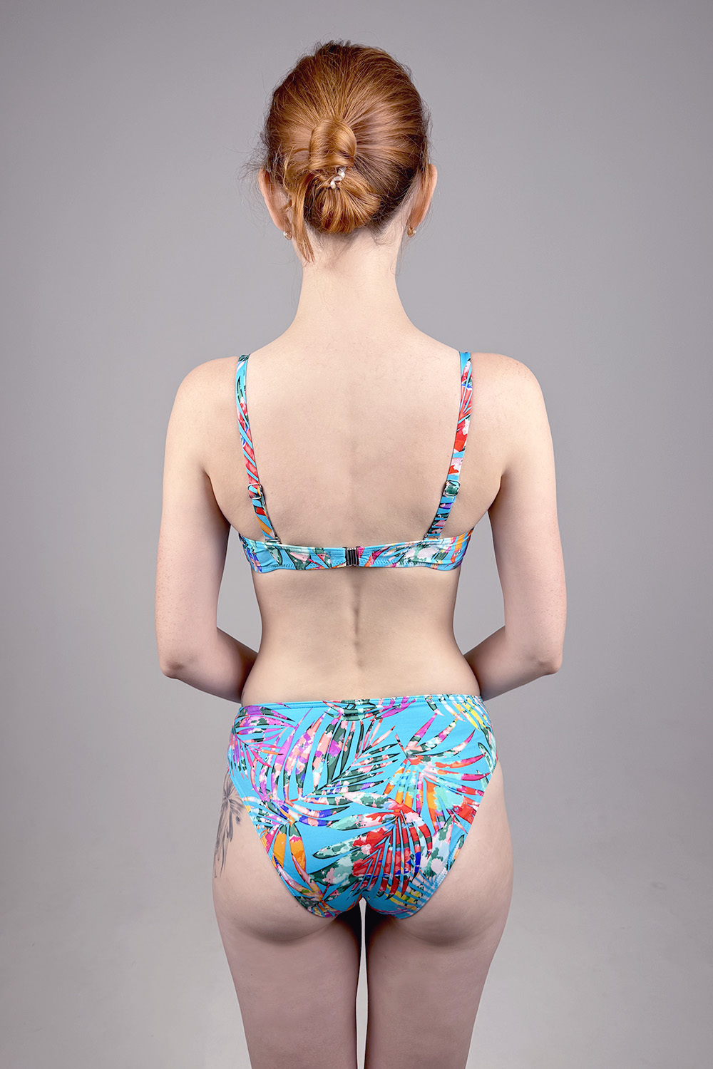 Раздельный купальник Liv голубого цвета с ярким цветочным принтом. Чашка push-up на косточках. Бретели отстегиваются и регулируются по длине, металлическая застежка на спине не регулируется. Плавки средней посадки.