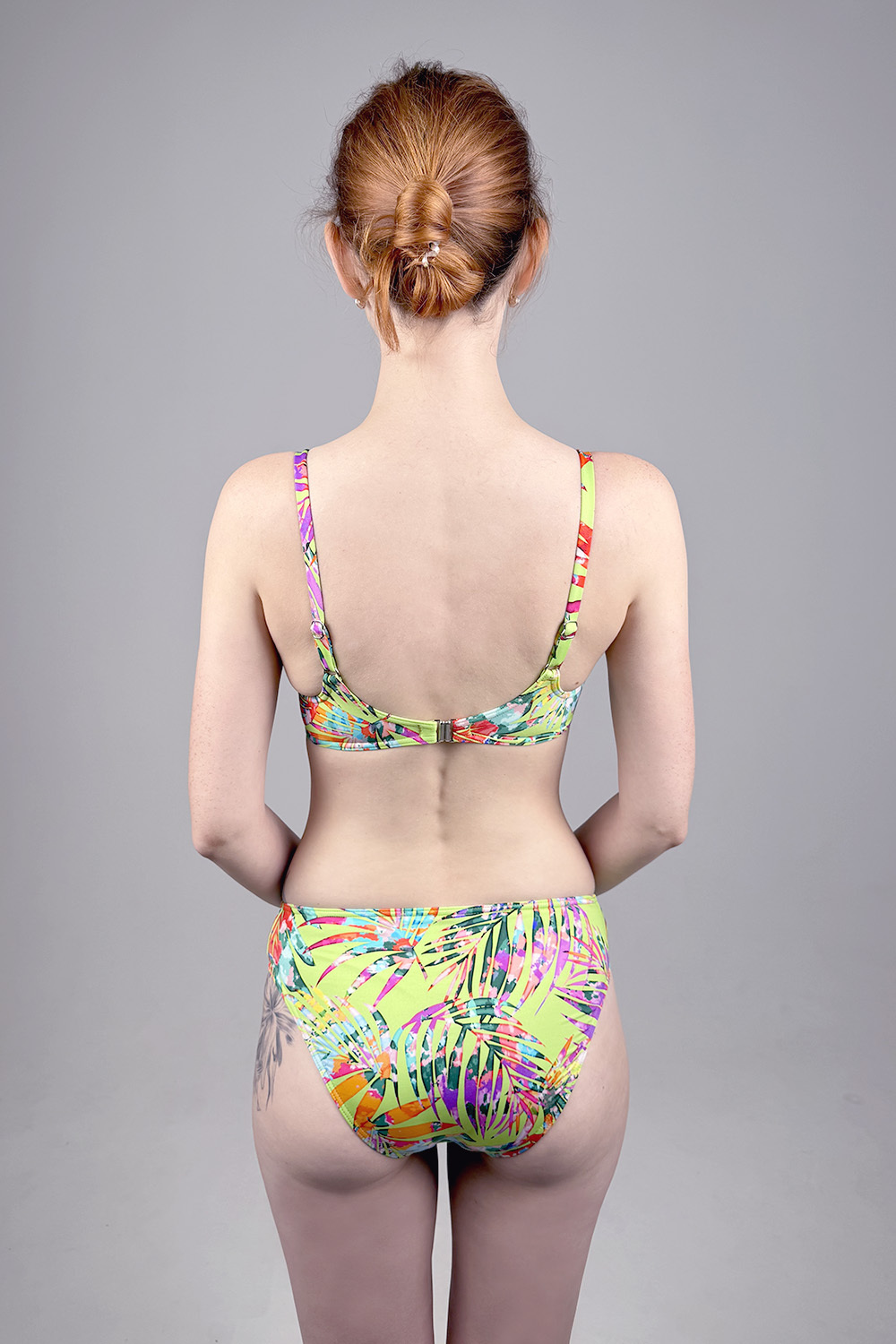Раздельный купальник Bonnie желто-зеленого цвета с ярким цветочным принтом. В размерах 38-42 идет уплотненная формованная чашка на косточках, в размерах 44-46 идет формованная чашка на косточках с вкладышами push-up. Лиф с боковой поддержкой, бретели регулируются по длине, пластиковая застежка на спине не регулируется. Плавки классической средней посадки.