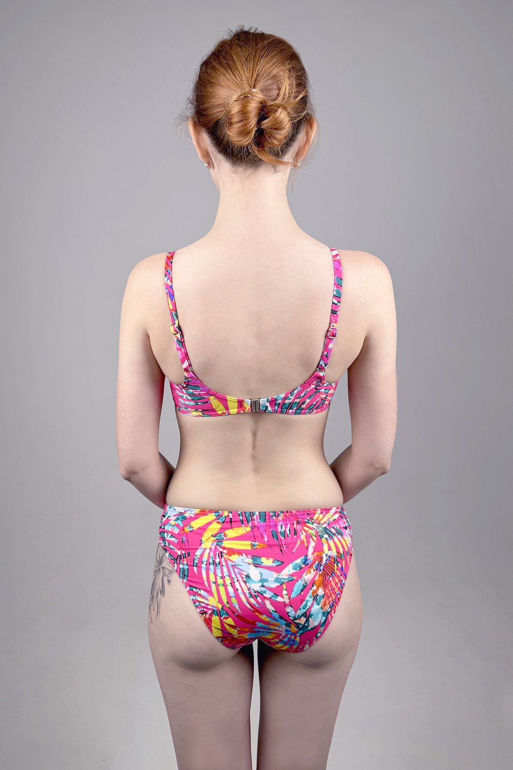 Раздельный купальник Bonnie розового цвета с ярким цветочным принтом. В размерах 38-42 идет уплотненная формованная чашка на косточках, в размерах 44-46 идет формованная чашка на косточках с вкладышами push-up. Лиф с боковой поддержкой, бретели регулируются по длине, пластиковая застежка на спине не регулируется. Плавки классической средней посадки.
