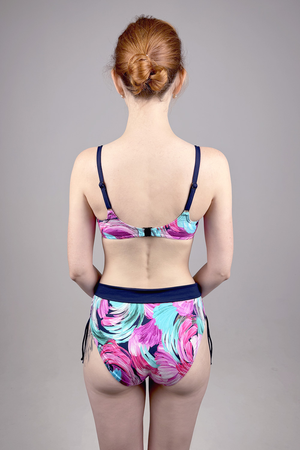 Раздельный купальник Fernanda темно-синего цвета с ярким разноцветным принтом. В размерах 40-42 идет уплотненная формованная чашка на косточках, в размерах 44-48 идет формованная чашка на косточках с вкладышами push-up. Лиф с боковой поддержкой, бретели регулируются по длине, пластиковая застежка на спине не регулируется. Плавки с завязками для регулировки обхвата, линия талии может изменяться за счет отворота в виде широкого пояса. Лиф и плавки продублированы подкладкой.
