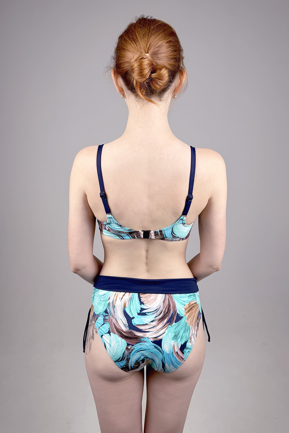 Раздельный купальник Fernanda темно-синего цвета с ярким разноцветным принтом. В размерах 40-42 идет уплотненная формованная чашка на косточках, в размерах 44-48 идет формованная чашка на косточках с вкладышами push-up. Лиф с боковой поддержкой, бретели регулируются по длине, пластиковая застежка на спине не регулируется. Плавки с завязками для регулировки обхвата, линия талии может изменяться за счет отворота в виде широкого пояса. Лиф и плавки продублированы подкладкой.