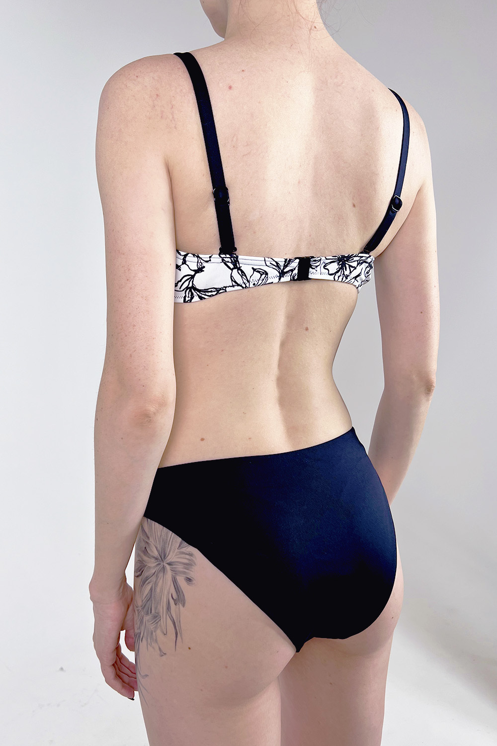 Раздельный купальник Diya черно-белого цвета. Чашка на тонком поролоне и косточках, есть боковые косточки. Съемные бретели регулируются по длине, пластиковая застежка на спине не регулируется.