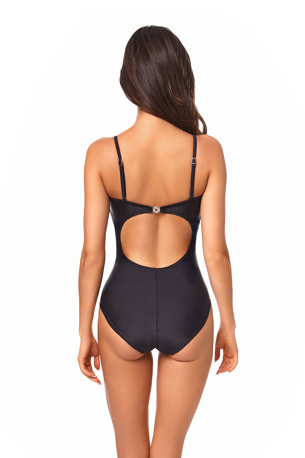 Эффектный слитный купальник с черно-белым принтом K.8083 с формованными чашками на каркасах. На спинке нерегулируемая застежка, бретели регулируются по длине.