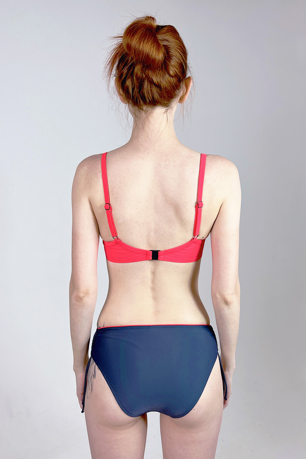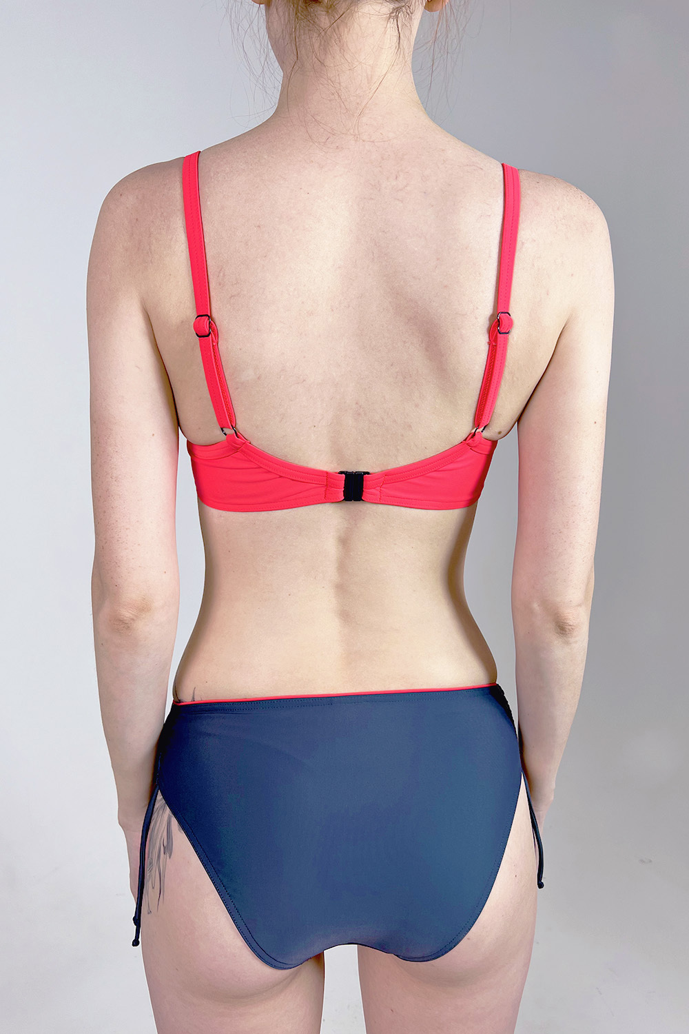 Красный купальник Laura с чашкой push-up на косточках. Бретели регулируются по длине, пластиковая застежка на спине нерегулируемая. Плавки цвета графит с высокой талией и завязками для регулировки обхвата. Фото обратной стороны купальника представлено в ознакомительных целях и показывает крой задней части, расцветка соответствует основному фото в карточке товара.