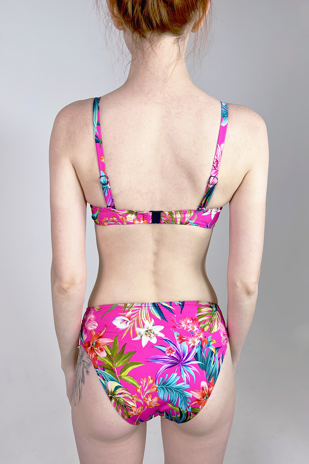 Раздельный купальник Liv розового цвета с ярким цветочным принтом. Чашки push-up на косточках. Бретели отстегиваются и регулируются по длине, пластиковая застежка на спине не регулируется. Плавки средней посадки.