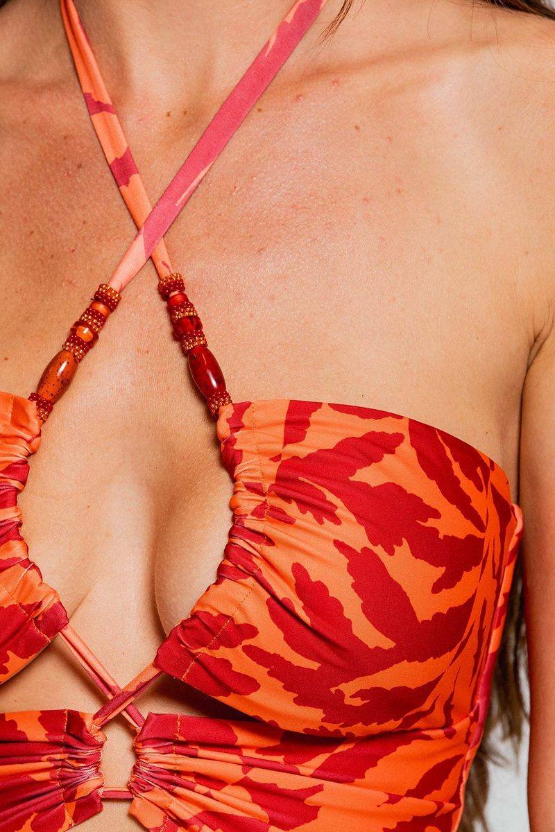 Элегантная и изысканная модель украшена качественной фурнитурой на концах завязки, что подчеркивает ее ручной характер. Модель на шнуровке спереди и с умеренной степенью покрытия сочетает в себе изысканность и комфорт. С бусинами на завязках. Спинка открыта. Чашка тонкий съемный поролон.