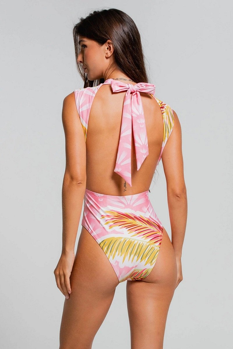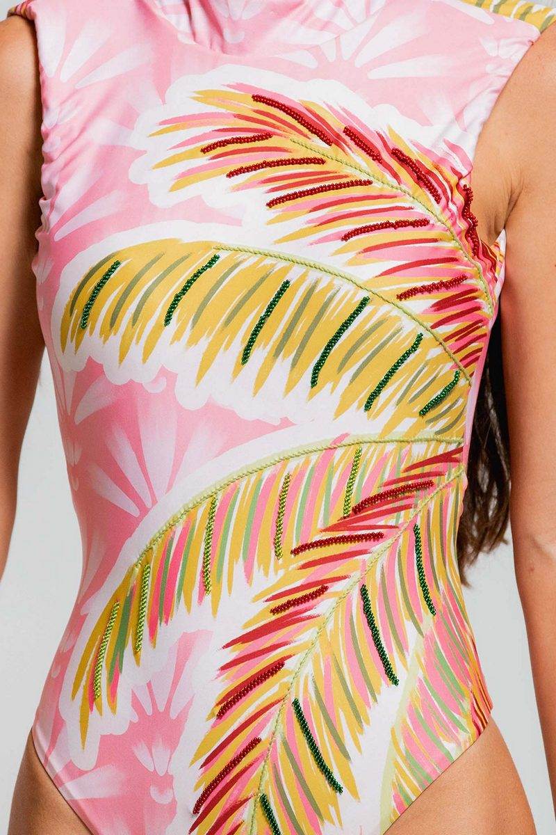 Слитный купальник от колумбийского бренда Cosita Linda — смелая и женственная модель с высоким воротом, украшенная ручной вышивкой и завязками. Кокетливый крой в стиле латиноамериканских танцев делает его идеальным для плавания. Чашка выполнена из тонкого съемного поролона, а спинка открыта.