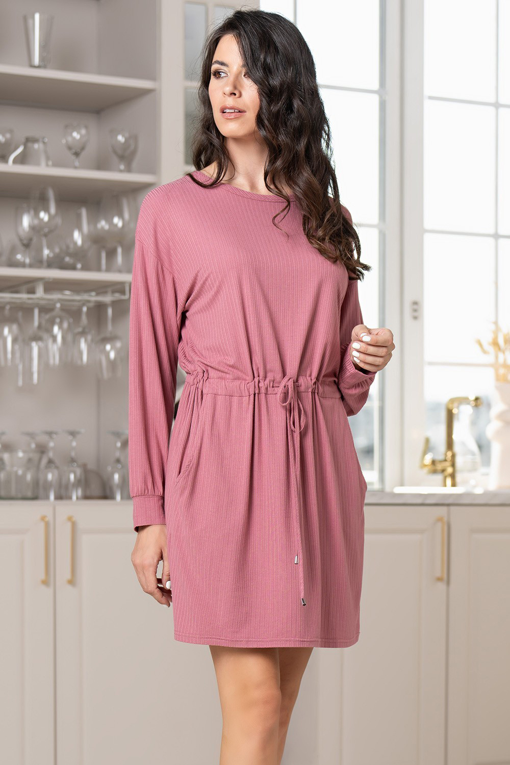 Туника до колен Mia-Amore выполнена из трикотажного полотна в рубчик. Туника с длинными втачными рукавами на манжетах по низу и кулиской на талии, которая регулирует силуэт изделия.