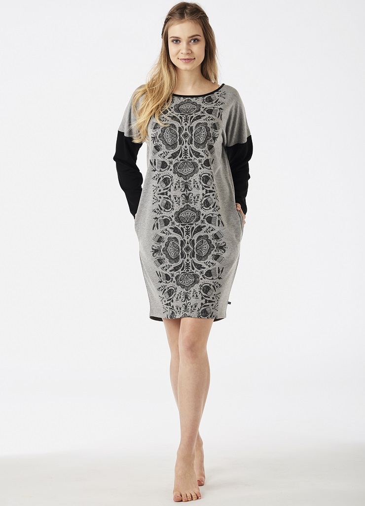Сорочка женская для дома и отдыха LHD 570 18/19. Элегантная модель из мягкого и теплого вискозного трикотажа. Уникальный искусный принт в народном стиле с изумрудным блеском. Вырез "лодочкой". Дополняют модель прорезные карманы.