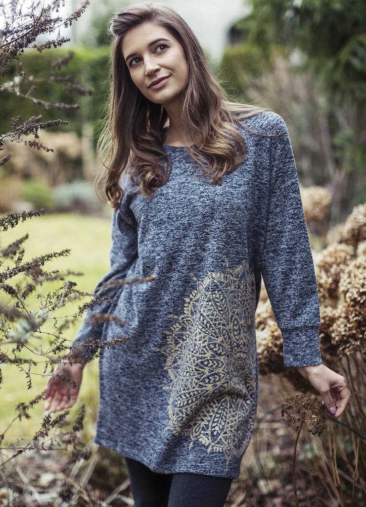 Элегантная туника LHD 895 18/19 из мягкого вискозного трикотажа. Свободный силуэт. Рукав длинный, с высокой манжетой. Декорирована большим узорным принтом с блестящим отливом.